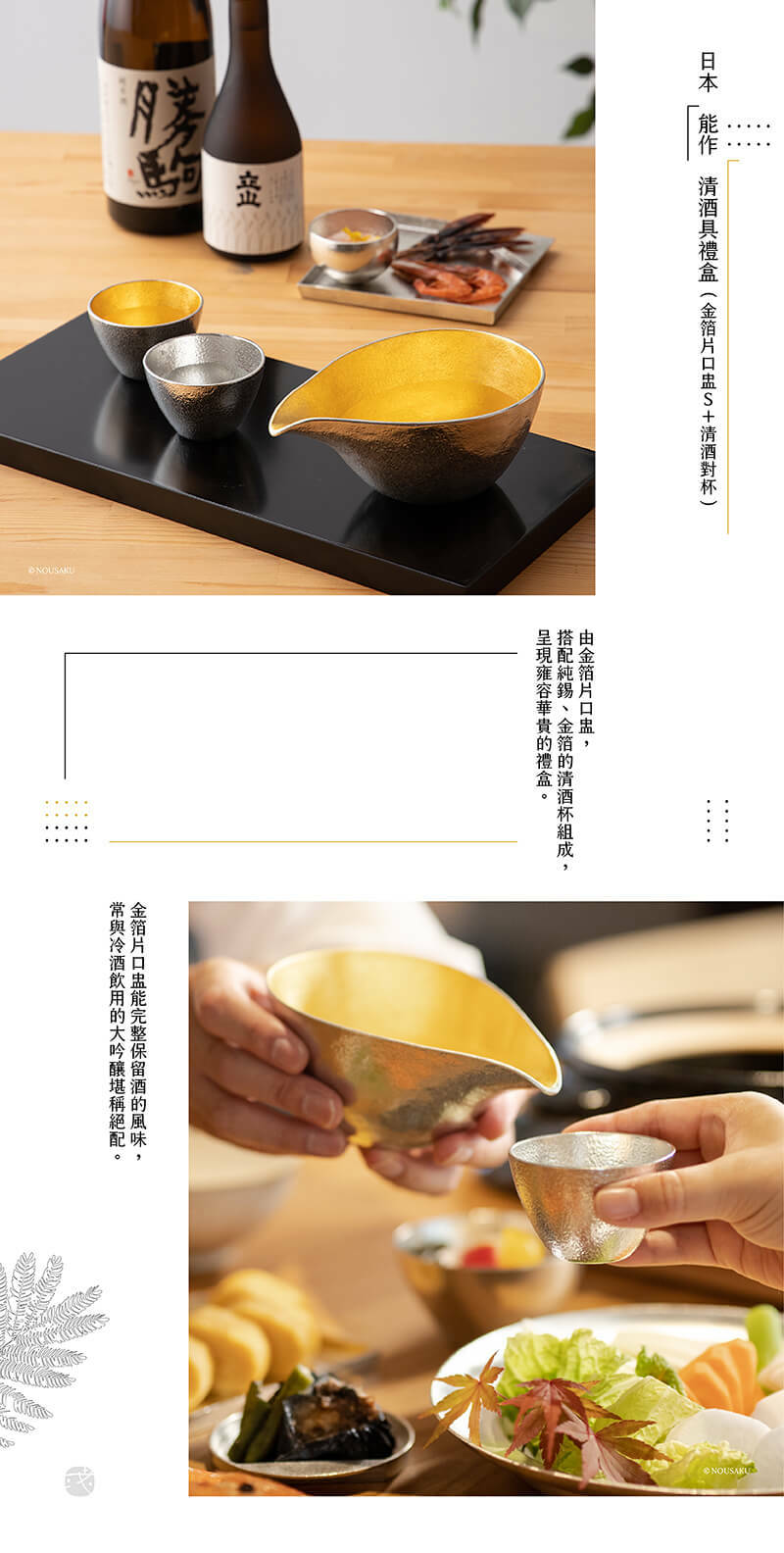 由金箔片口盅,搭配純錫、金箔的清酒杯組成,呈現雍容華貴的禮盒;金箔片口盅能完整保留酒的風味,與常以冷酒飲用的大吟釀堪稱絕配!