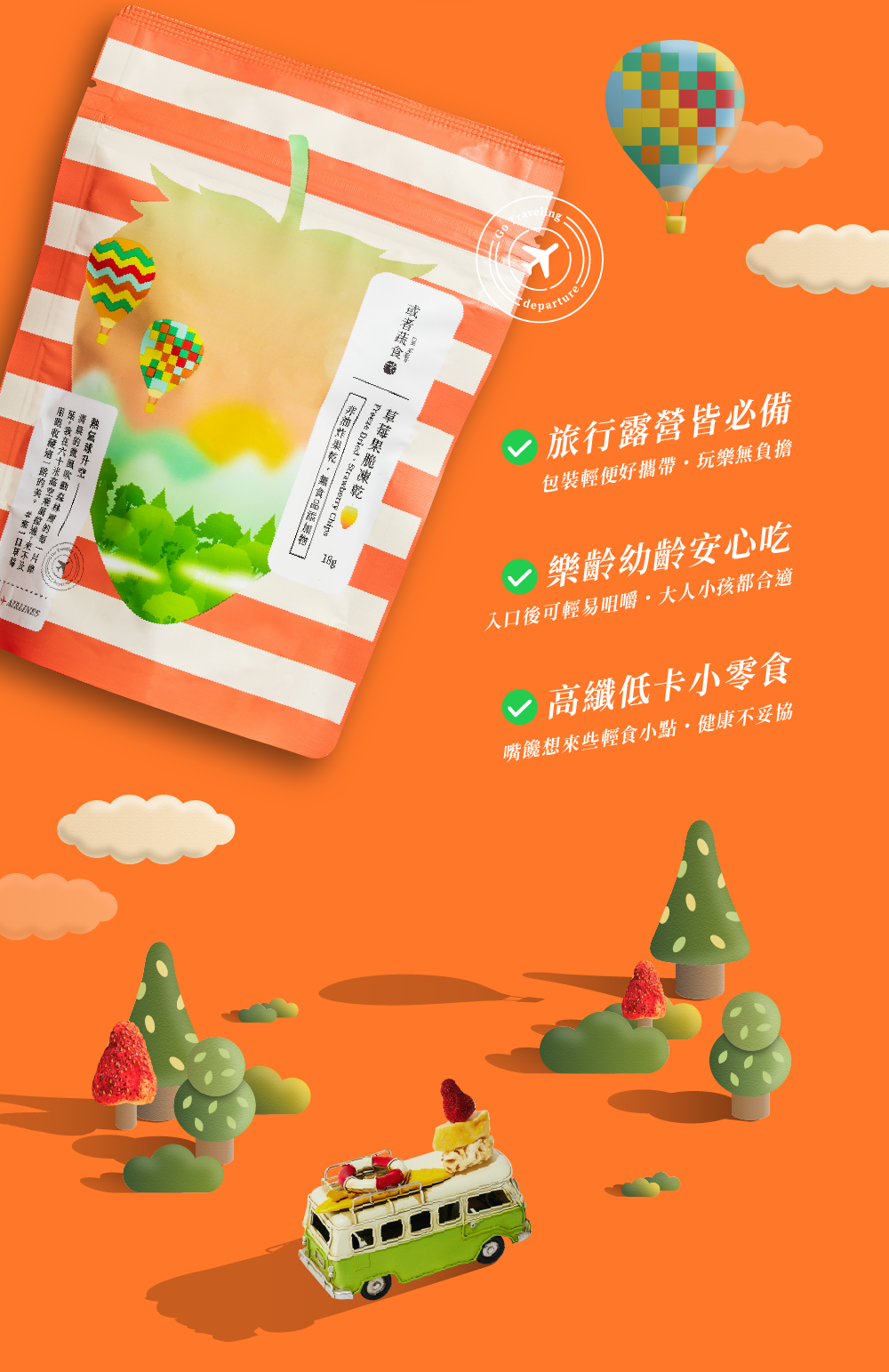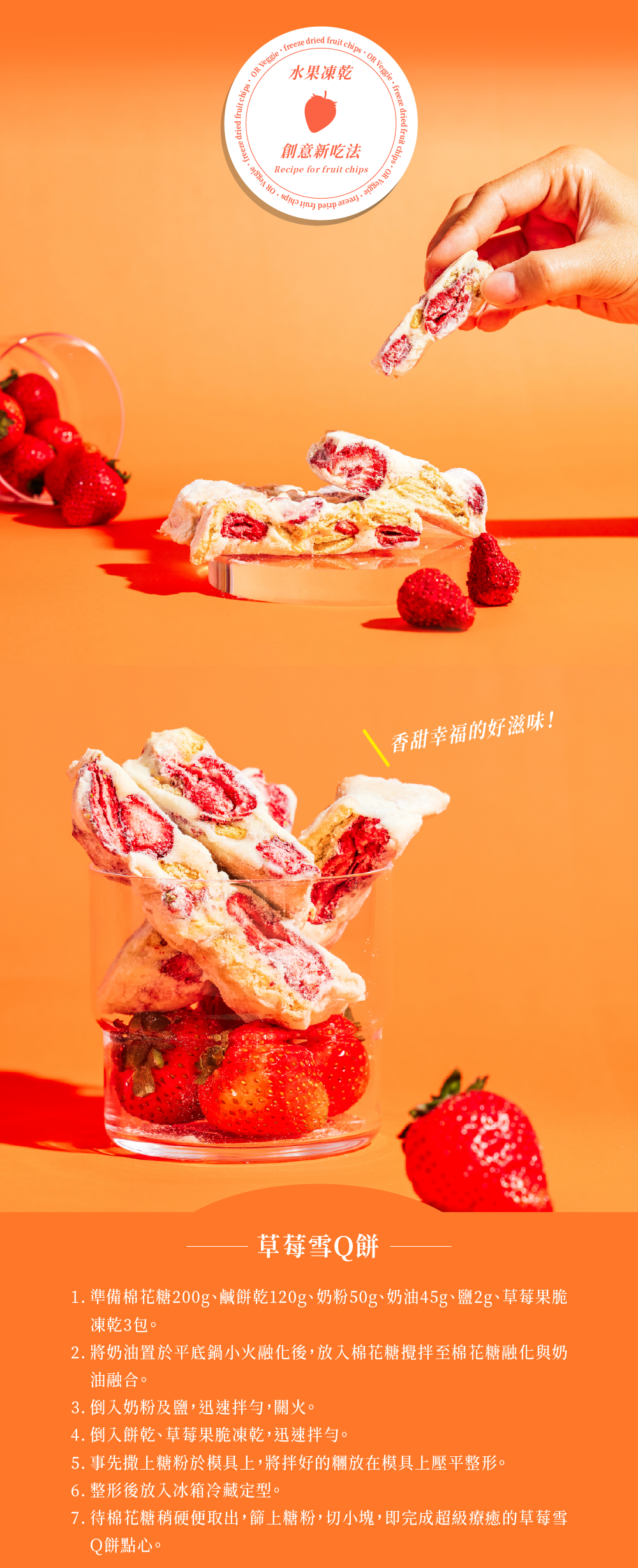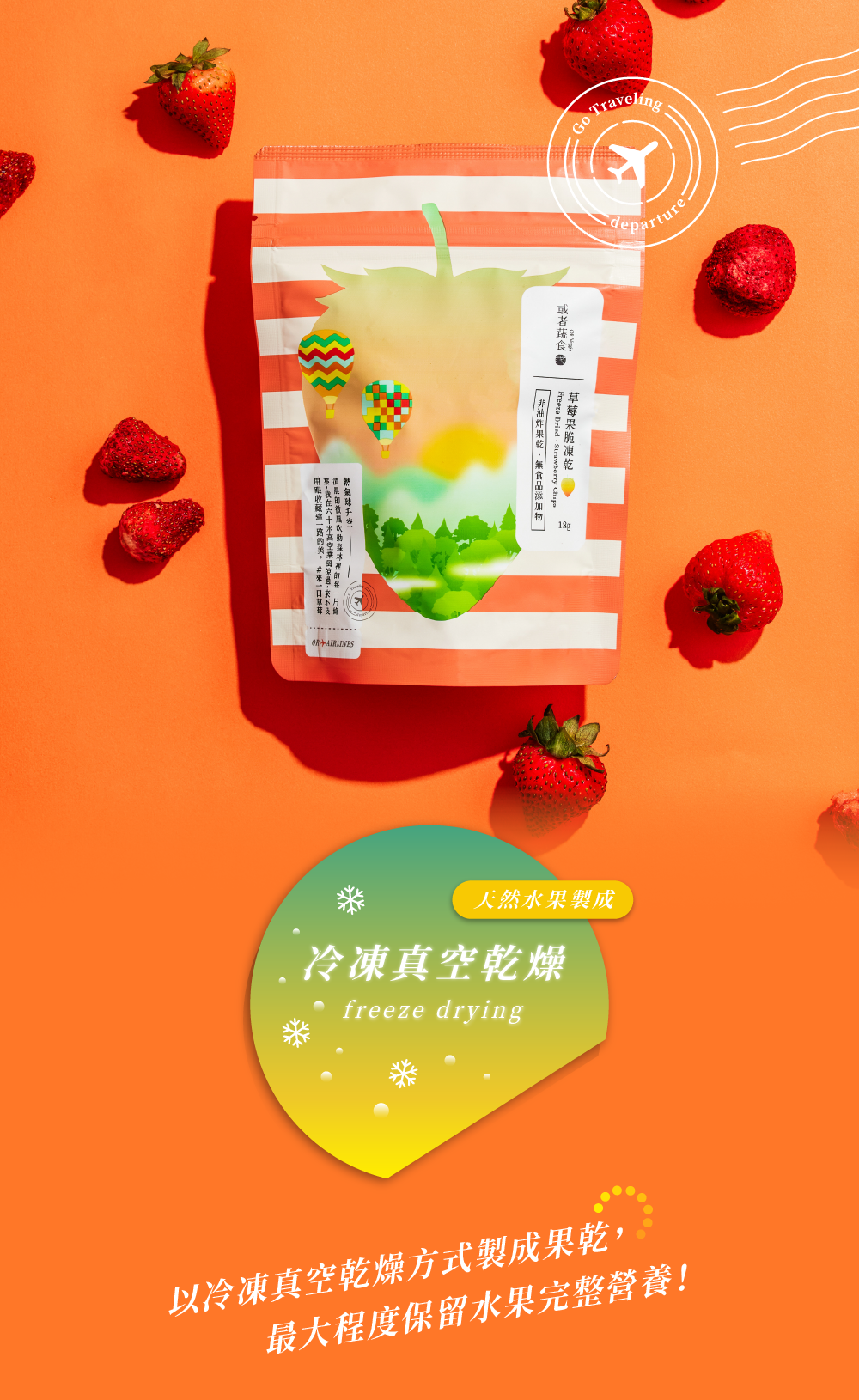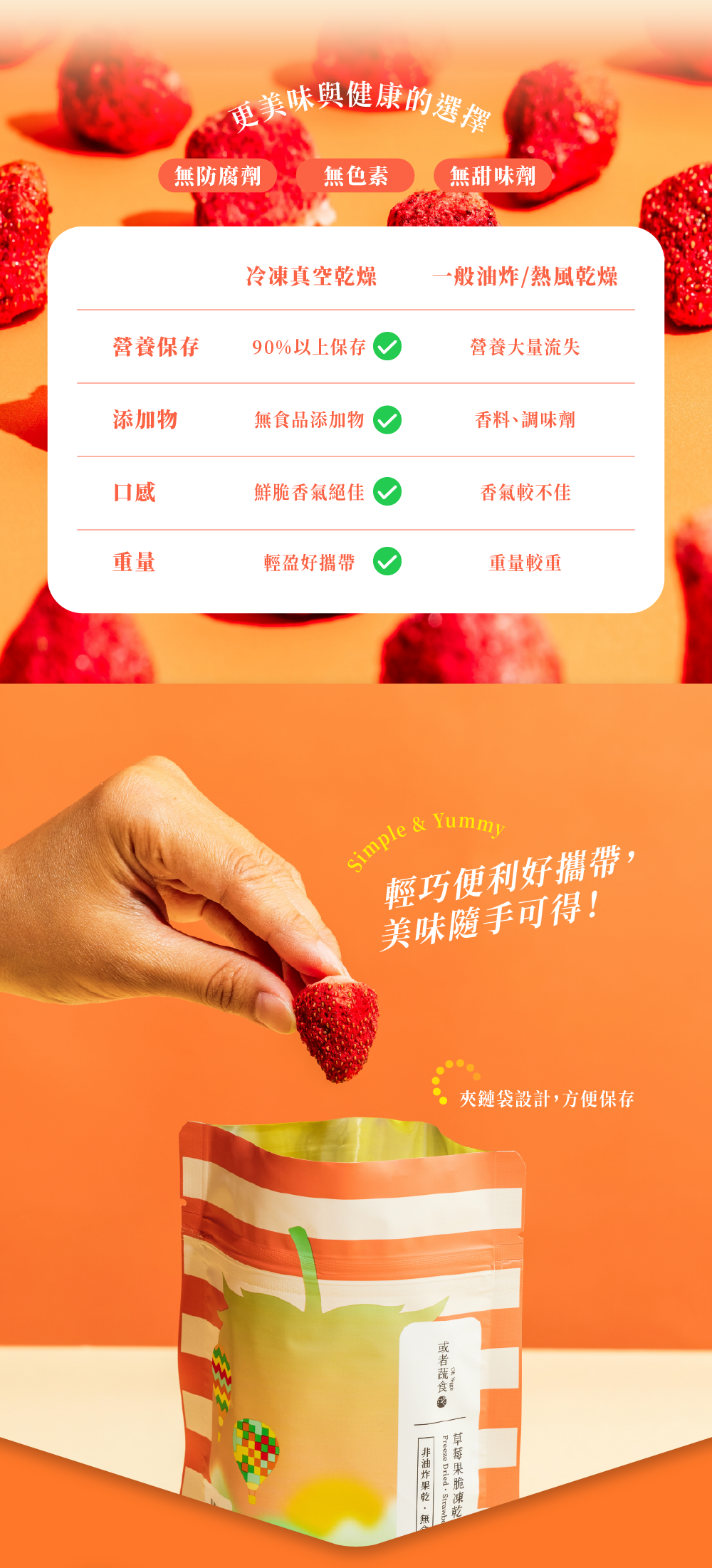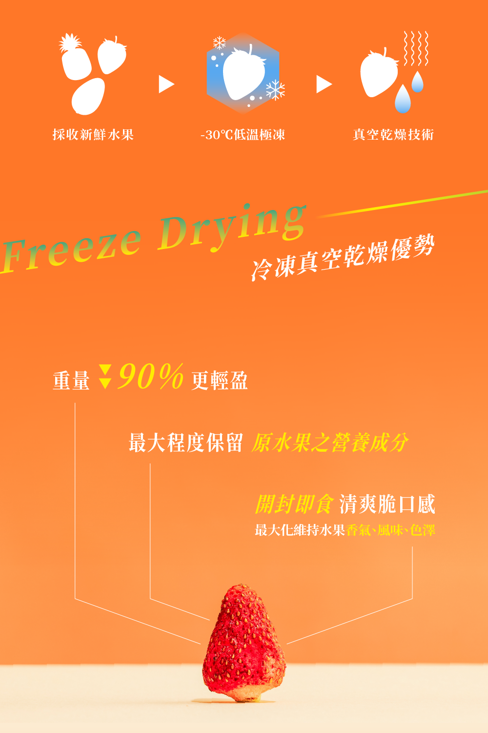 以「-30°冷凍」與「真空乾燥技術」,去除水果中水分,最大程度保留水果天然纖維、香氣及口感,封存滿滿營養成分!乾燥技術同時讓果物超輕量,果乾口感酥脆,入口即化,營養美味方便隨身帶著走!