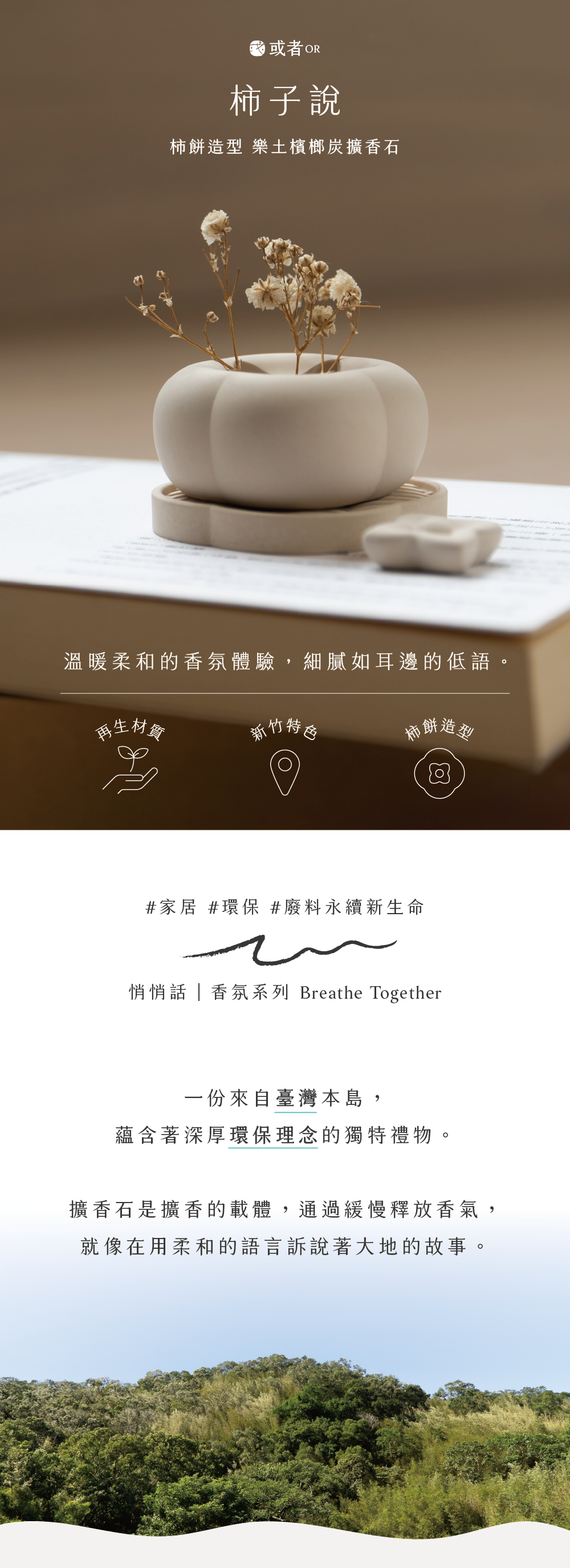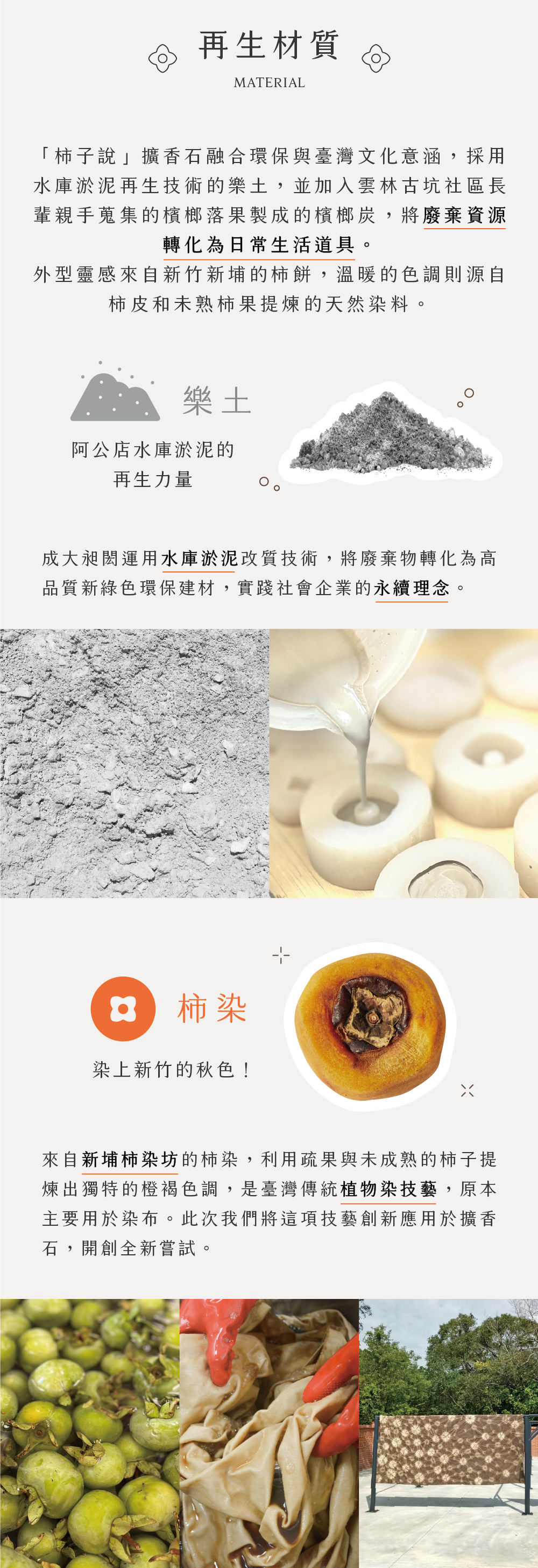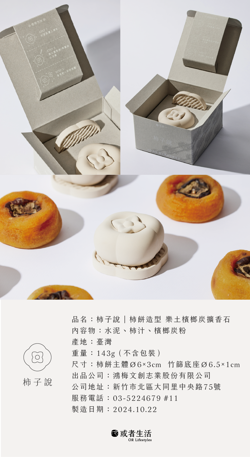 「柿子說」擴香石融合環保與臺灣文化意涵,採用水庫淤泥再生技術的樂土,並加入雲林古坑社區長輩親手蒐集的檳榔落果製成的檳榔炭,將廢棄資源轉化為日常生活道具。外型靈感來自新竹新埔的柿餅,溫暖的色調源自柿皮和未熟柿果提煉的天然染料。