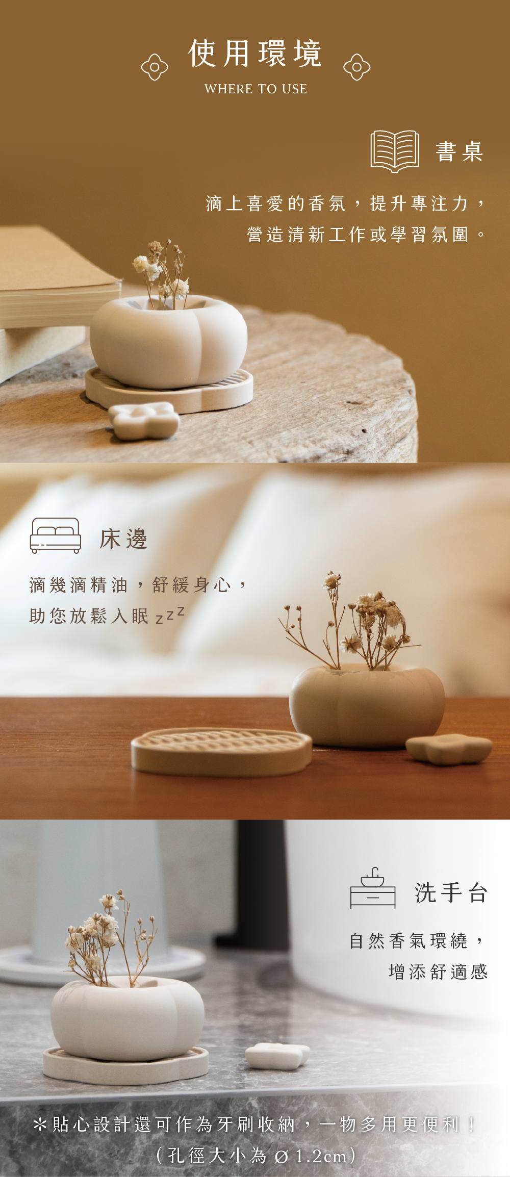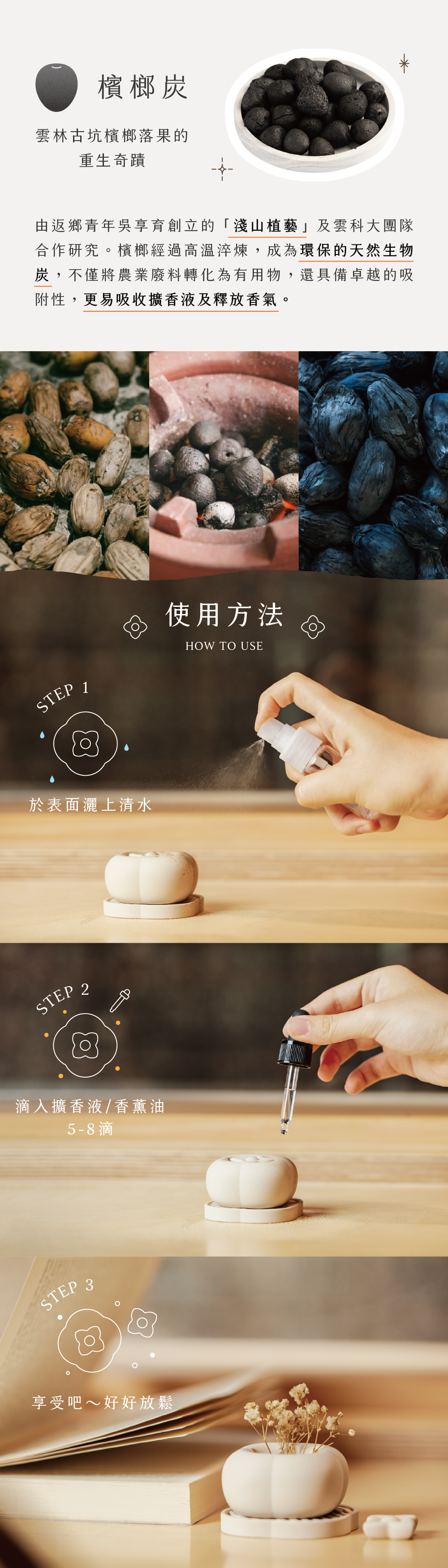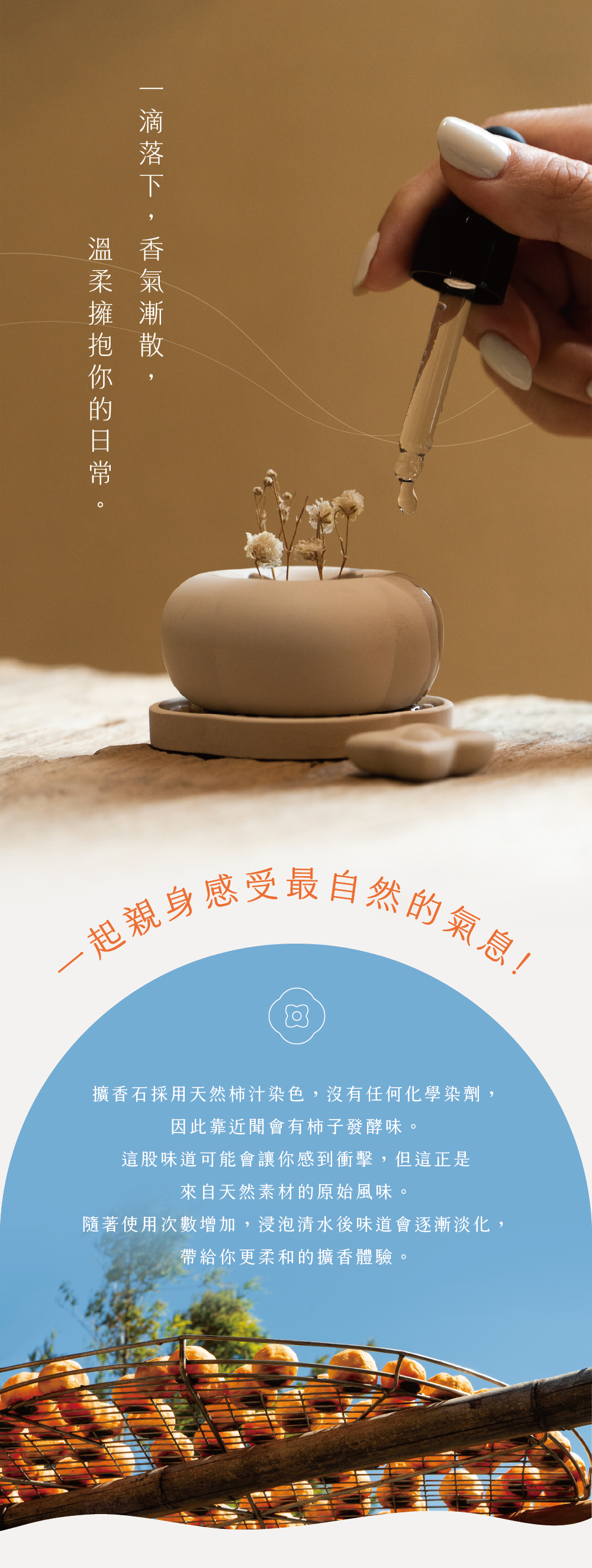 「柿子說」擴香石融合環保與臺灣文化意涵,採用水庫淤泥再生技術的樂土,並加入雲林古坑社區長輩親手蒐集的檳榔落果製成的檳榔炭,將廢棄資源轉化為日常生活道具。外型靈感來自新竹新埔的柿餅,溫暖的色調源自柿皮和未熟柿果提煉的天然染料。