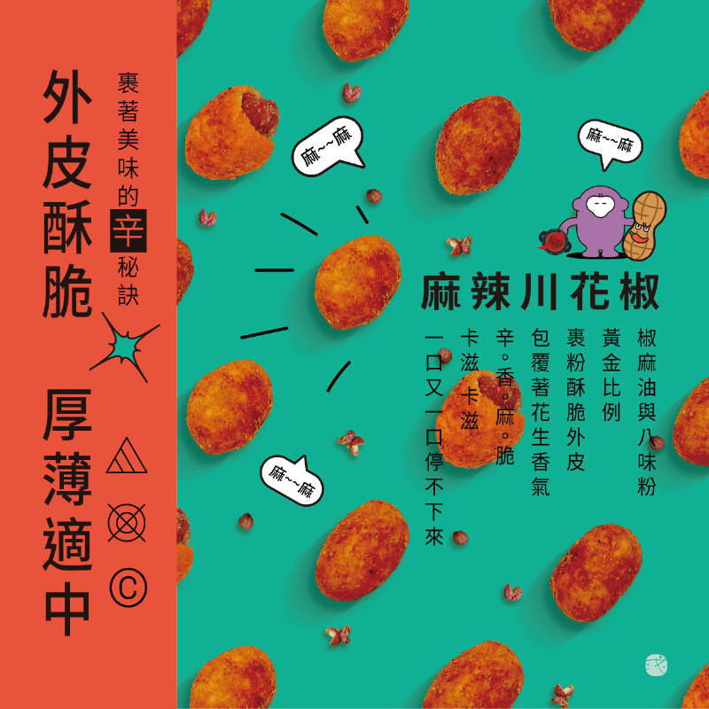 以辛香濃郁的大紅袍辣油再加入品牌獨家研發八味粉,由八角、三奈、桂皮、花椒等辛香料黃金比例調製,裹粉酥脆外皮包覆著花生香氣,辛、香、麻、脆一次擁有。