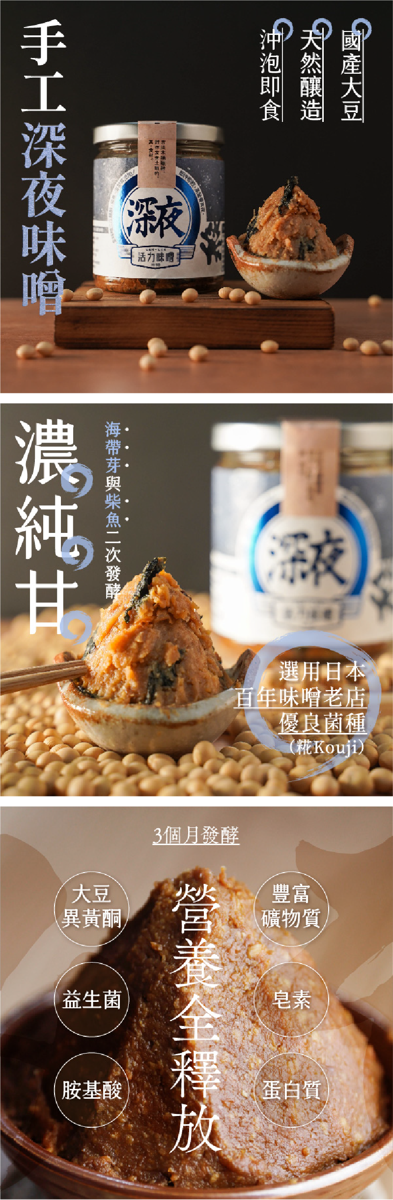 ●成分:國產非基改黃豆 、禾乃川米麴、洲南日曬海鹽、水、海帶芽、柴魚片