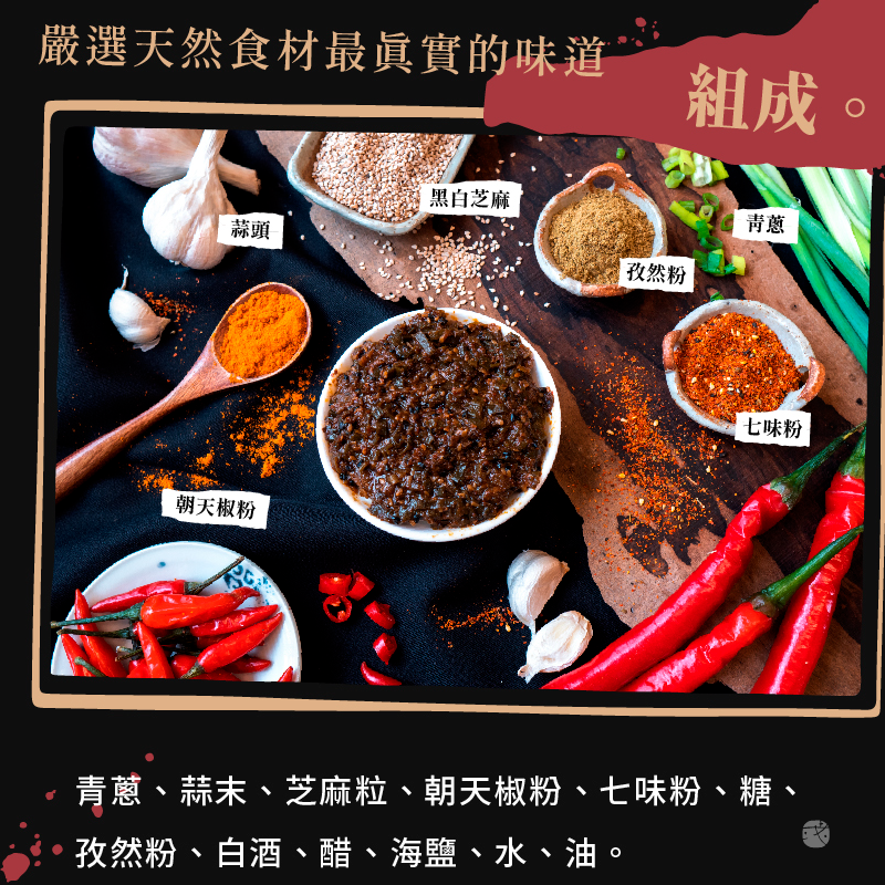 ●成分:原料:蔥.水.葵花油.七味粉.糖.白醋.食鹽.蒜頭.孜然粉.白芝麻.黑芝麻.朝天椒粉