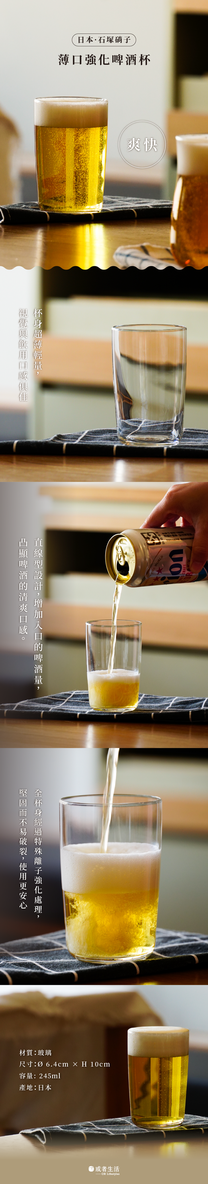 本款「爽快」為直線型設計,提升啤酒入口量,凸顯暢快清爽口感。搭配超薄杯口與強化玻璃,飲用手感與安心度兼具,讓每一口都更盡興。