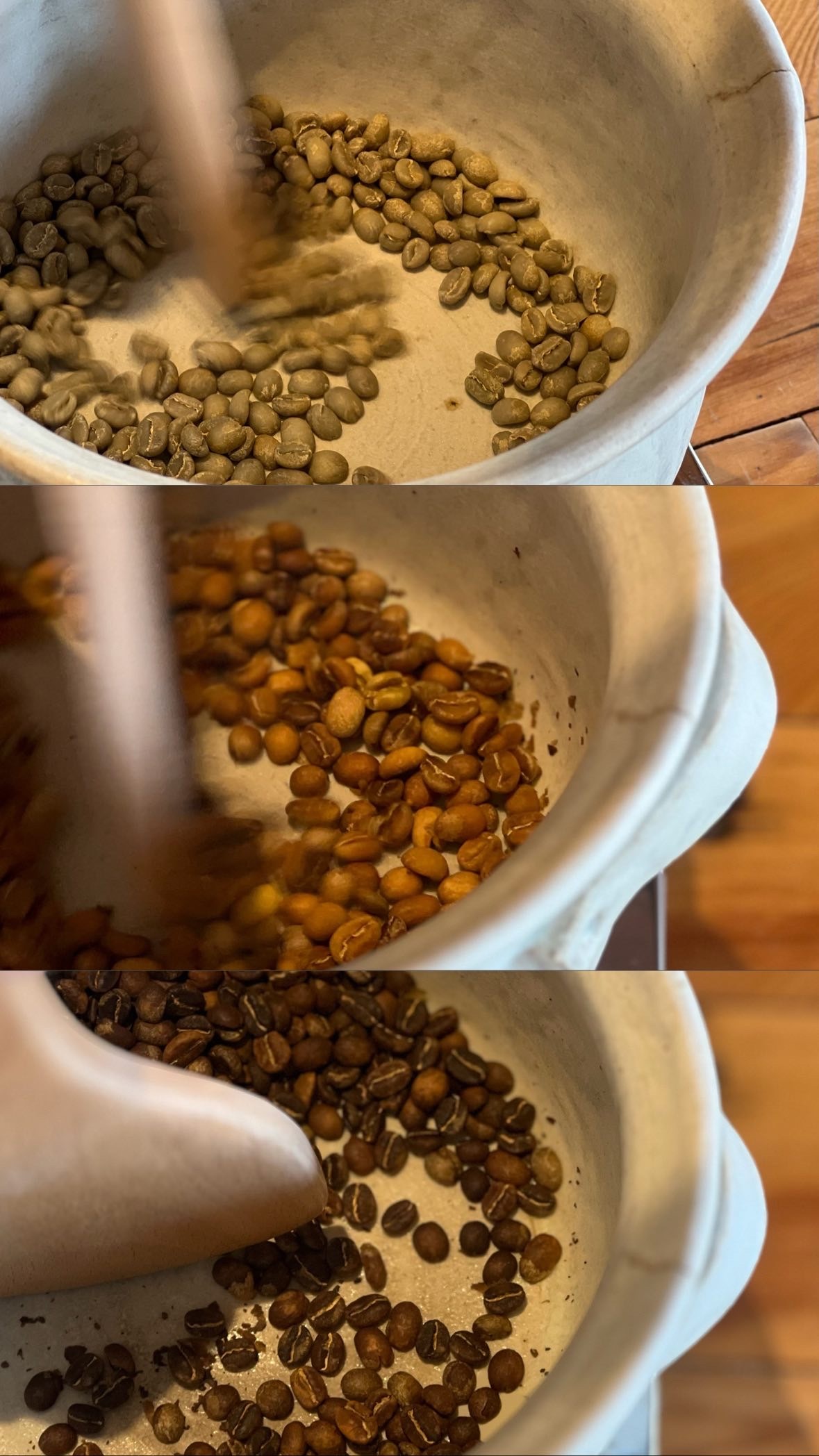 *在學習機器烘豆時邊精進陶鍋烘豆的經驗,後來決定使用陶鍋做為烘豆的工具
