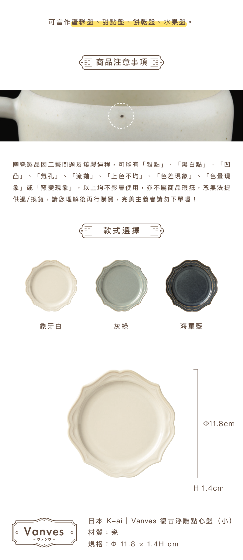 陶瓷製品因工藝問題及燒製過程,可能有「雜點」、「黑白點」、「凹凸」、「氣孔」、「流釉」、「上色不均」、「色差現象」、「色暈現象」或「窯變現象」,以上均不影響使