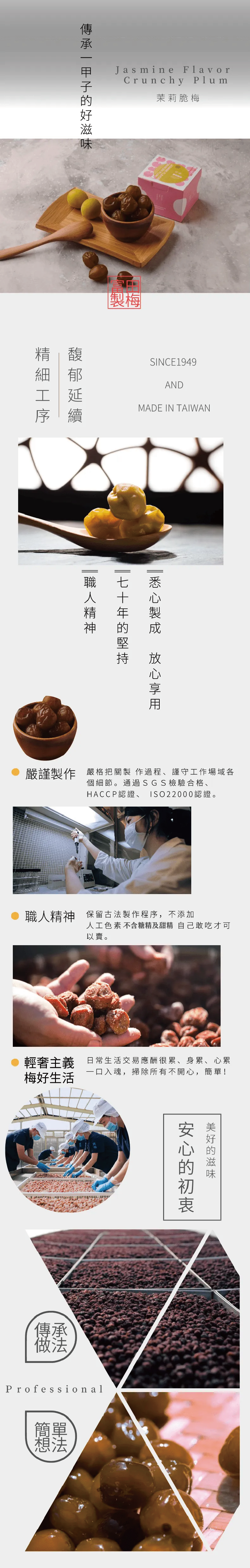 手摘清明節前的酸澀青梅佐以花壇農會頂級茉莉花乾透過富田獨家工藝展現,茉莉清香搭配酸澀脆梅,有著傳承一甲子的好滋味。
