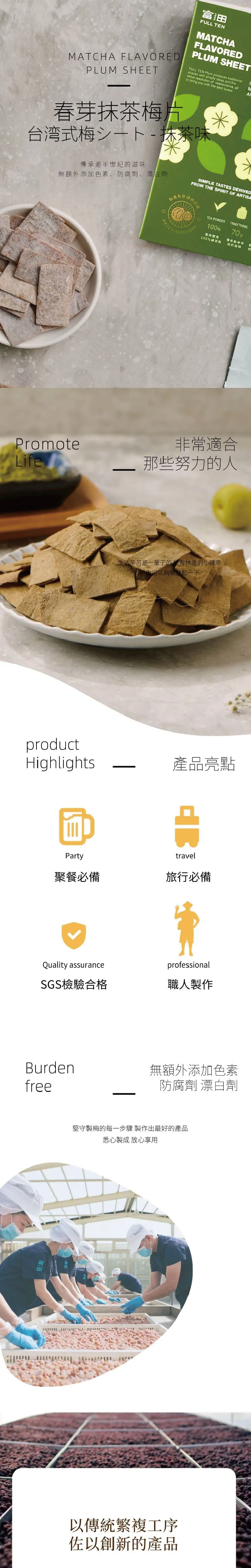 濃厚梅味、酸甜口感、2X4公分的黃金比例,5片分裝的安心分享。 三大無添加 - 無防腐劑、無漂白劑、無色素。