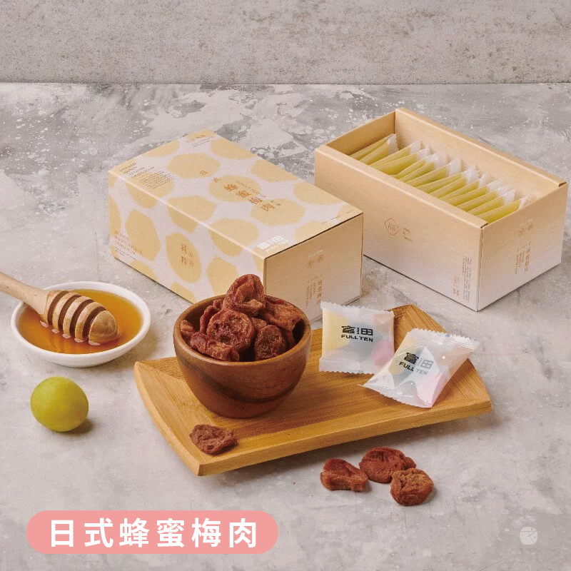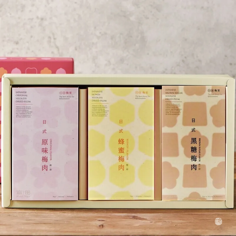 富田蜜餞禮盒精選經典與創新口味,包括黑糖梅肉、蜂蜜梅肉與原味梅肉,每款皆獨立小包分裝,密封保鮮。酸甜鹹俱全,加入蜂蜜與黑糖風味,兼具傳統與新意,是實惠又吸引年輕客群的禮盒選擇。