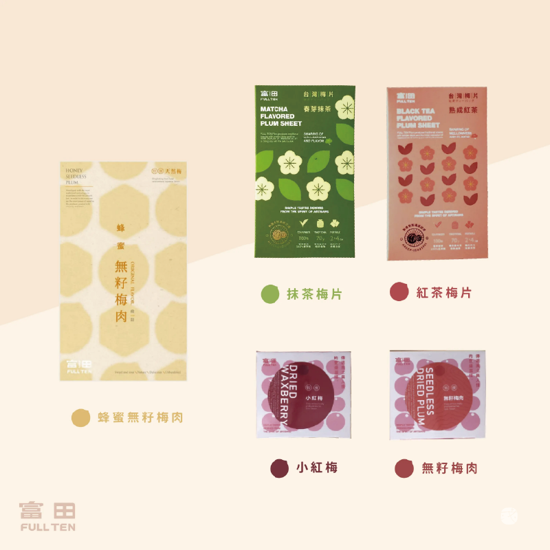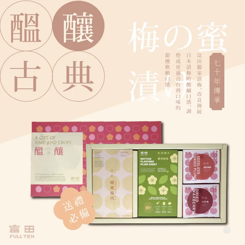 富田蜜餞禮盒集合5種經典與創新口味,包括蜂蜜無籽梅肉、抹茶梅片、紅茶梅片、小紅梅與無籽梅肉。酸甜鹹俱全,並加入蜂蜜與抹茶特殊風味吸引年輕客群,每款皆獨立小包分裝,密封保鮮,是實惠又美味的禮盒選擇。