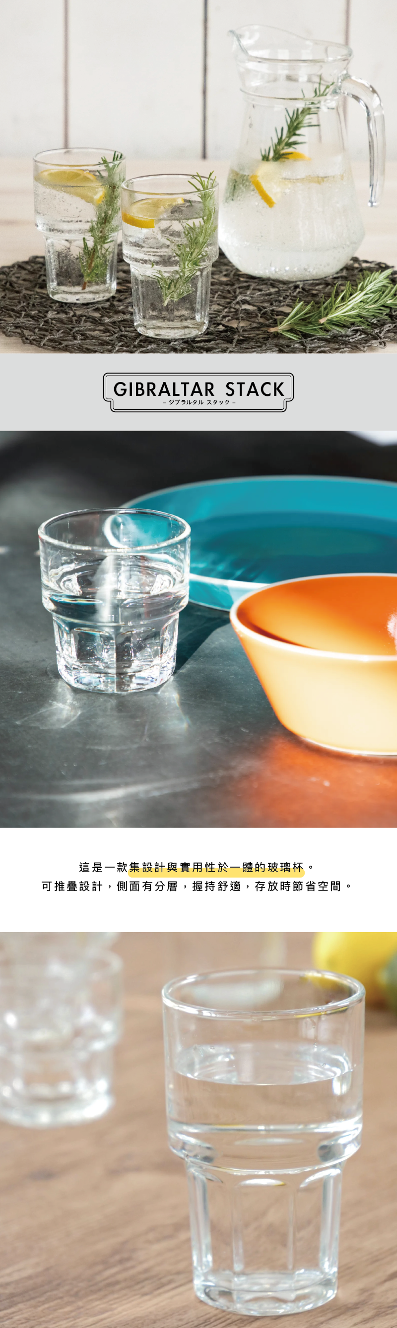 這是一款集設計與實用性於一體的玻璃杯。可推疊設計,側面有分層,握持舒適,存放時節省空間。