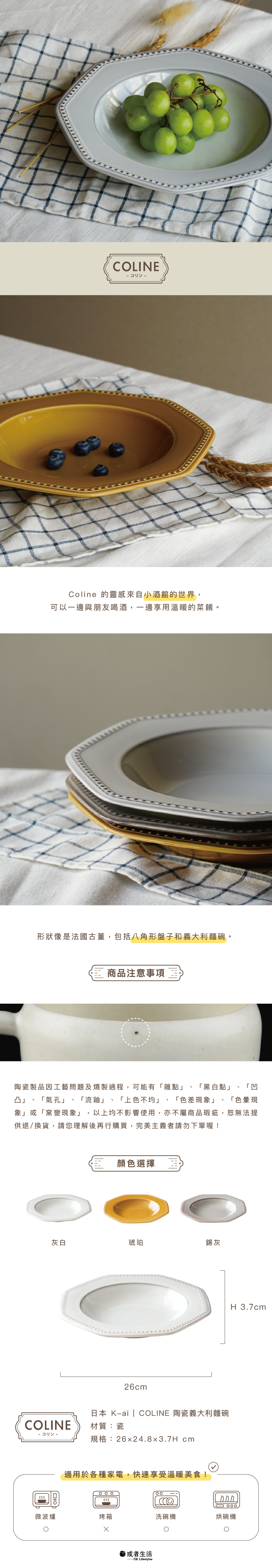 Coline 餐具靈感來自法式小酒館,融合古董造型與自然做舊質感,義大利麵碗設計溫潤細緻,握感舒適,可營造溫馨自在的用餐氛圍。