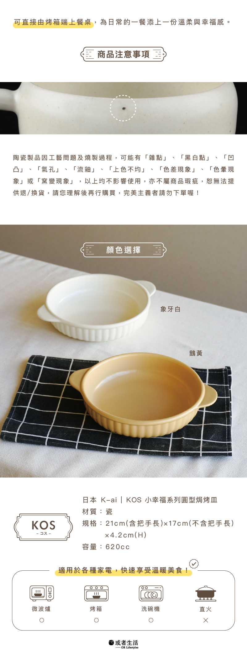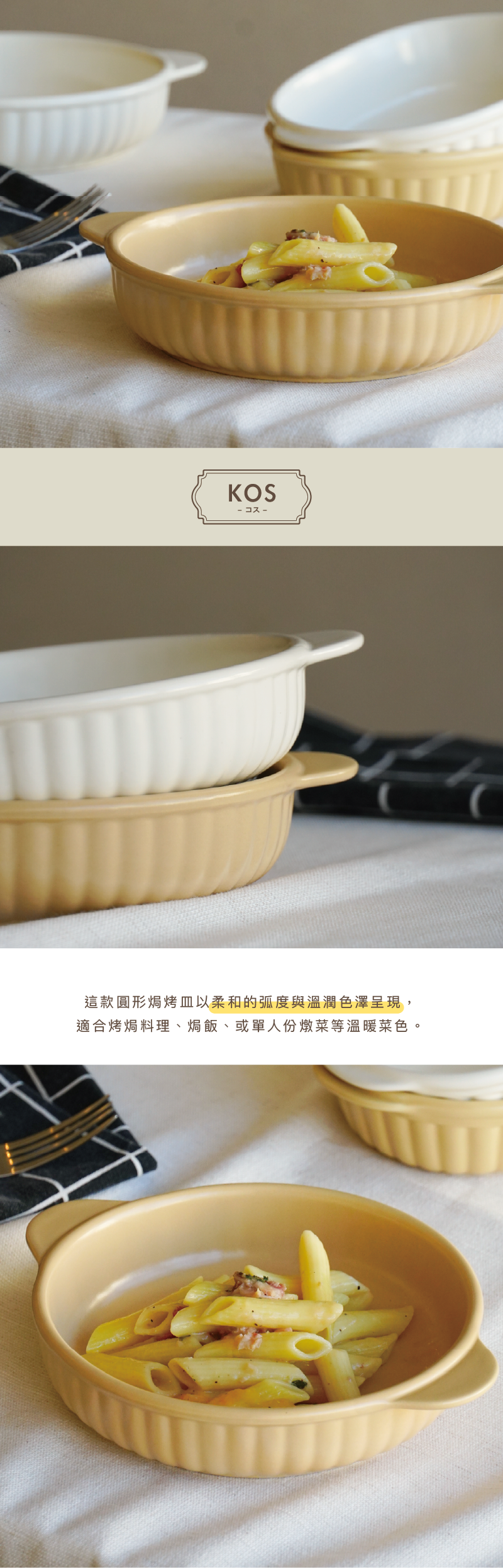 「KOS」在挪威語意指「放鬆與細微幸福」。圓形焗烤皿以柔和弧度與溫潤色澤呈現,適合烤焗、焗飯或燉菜,可直接上桌,為日常餐桌增添一份溫柔與幸福感。