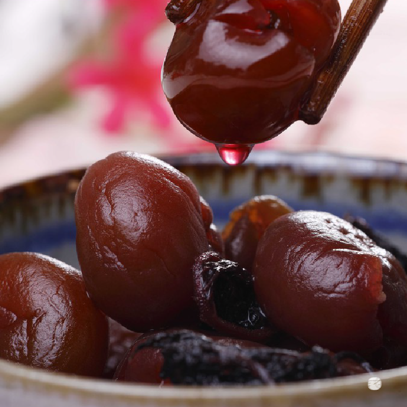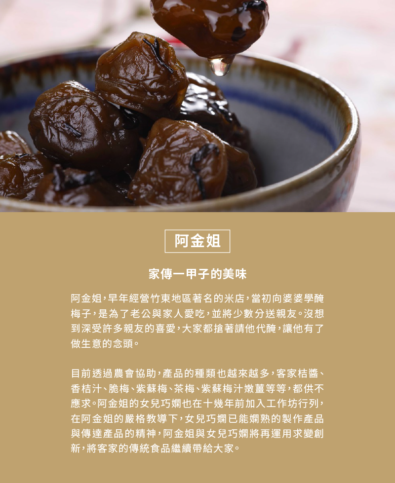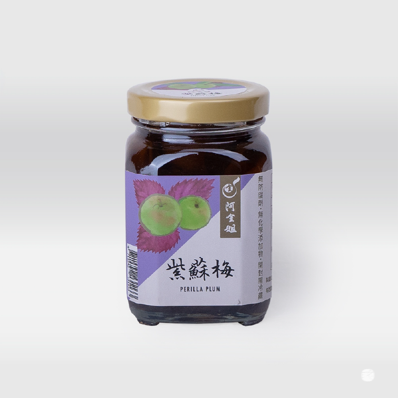 採用8分熟的青梅,洗淨後日曬釀製,甜中微酸的口感並有獨特的客家紫蘇釀造入味。