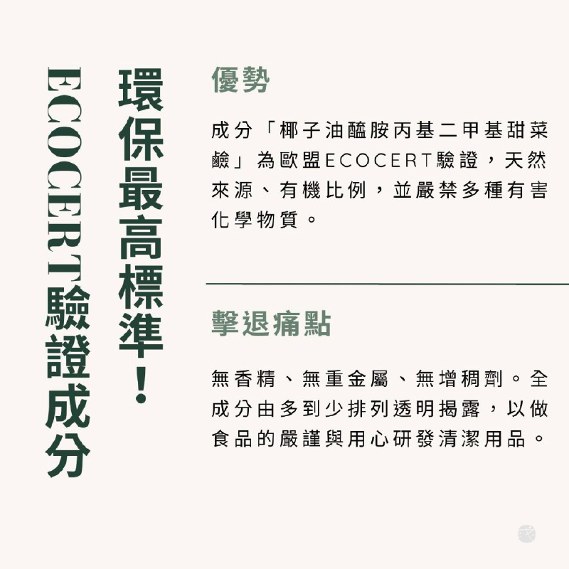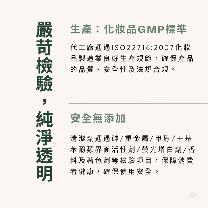 採用洗面乳等級的月桂醯基肌胺酸鈉,溫和潔淨不傷手;產品由通過 ISO 22716:2007 認證的代工廠製造,無香精並通過多項檢驗,一瓶多用途清潔,適用各種居家場景✨