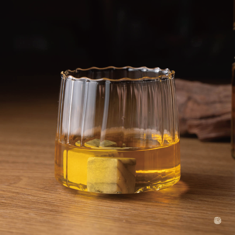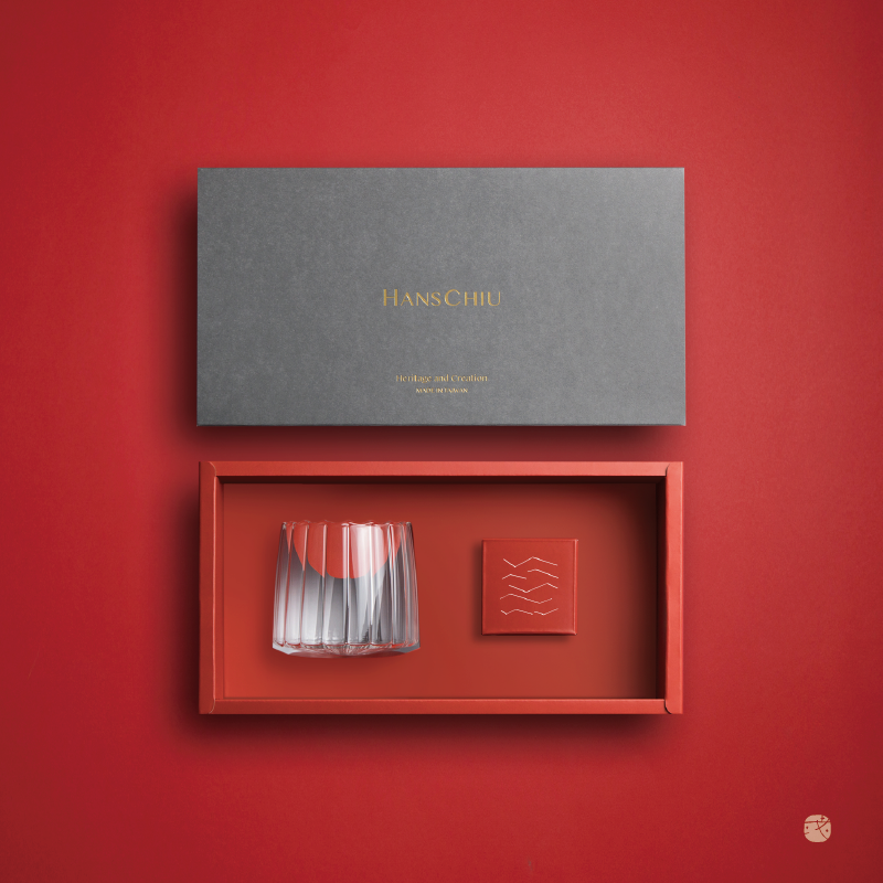 灰色精品禮盒搭配簡潔幾何山形燙金,象徵台灣之美。高規格工藝玻璃與精裝設計,杯底特殊造型讓酒液旋轉舞動,立體紋路折射璀璨光影,冰塊碰撞猶如清脆交響,增添品飲樂趣。