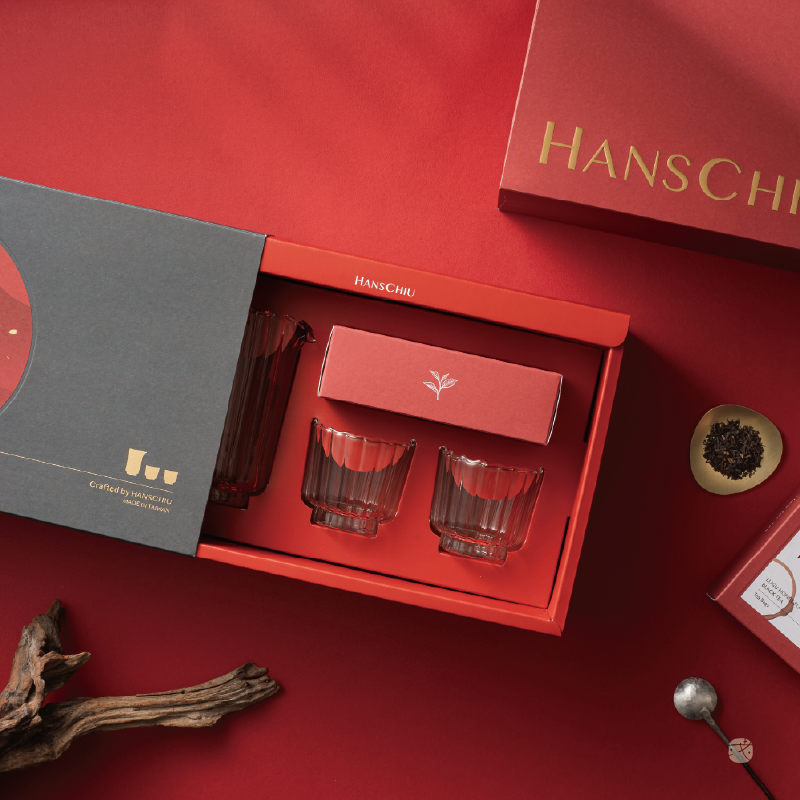 手工玻璃茶海一件與小茶杯兩件,搭配嚴選鹿谷老欉蜜香紅茶。精緻器皿結合甘醇果蜜茶香,無論自用或送禮都相宜。
