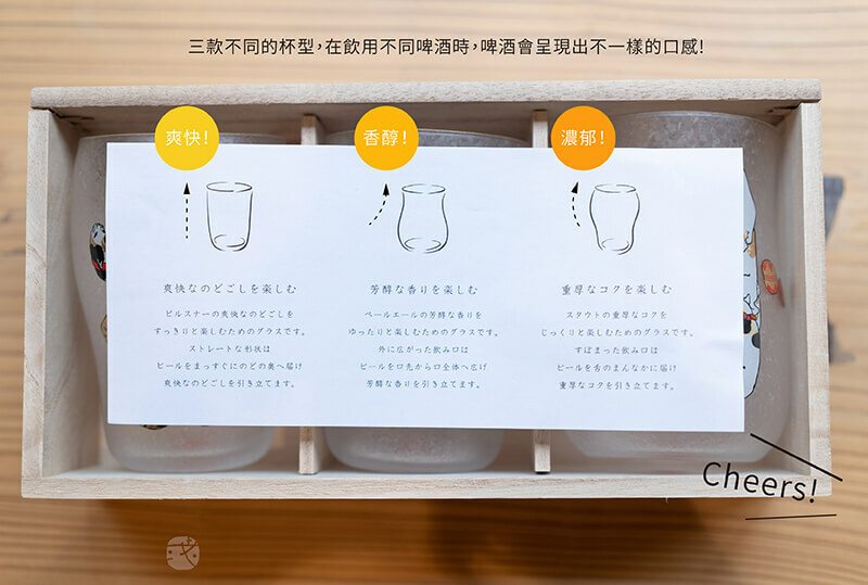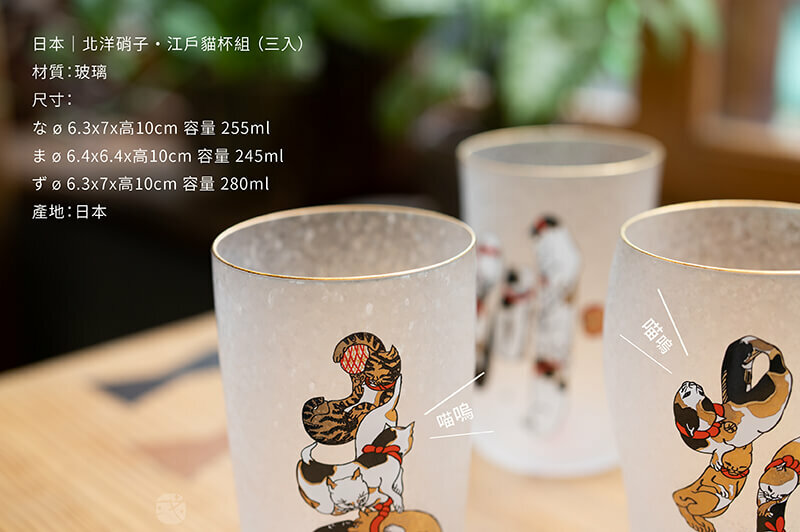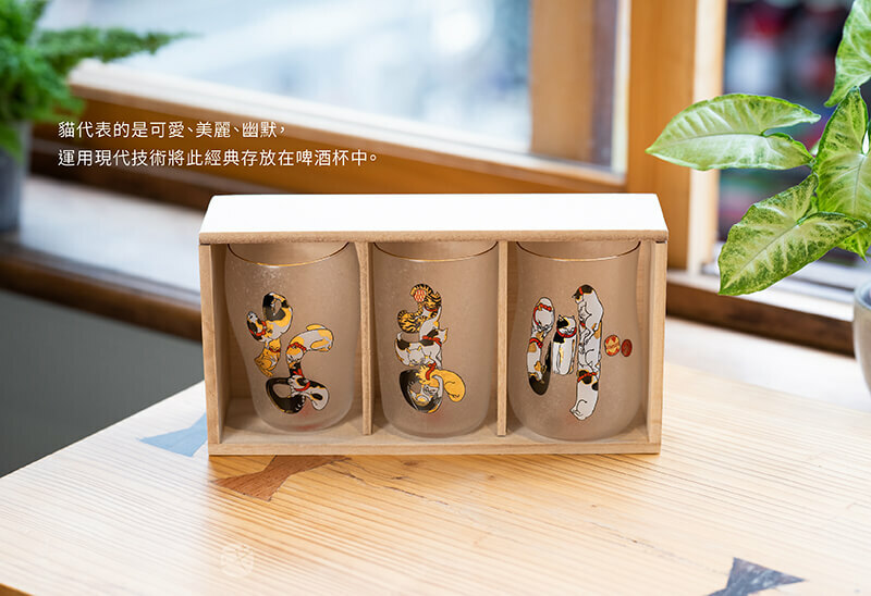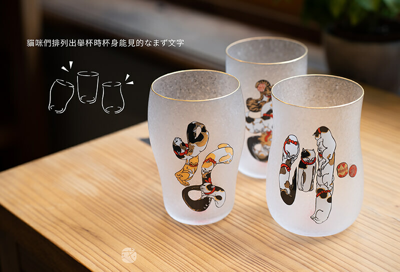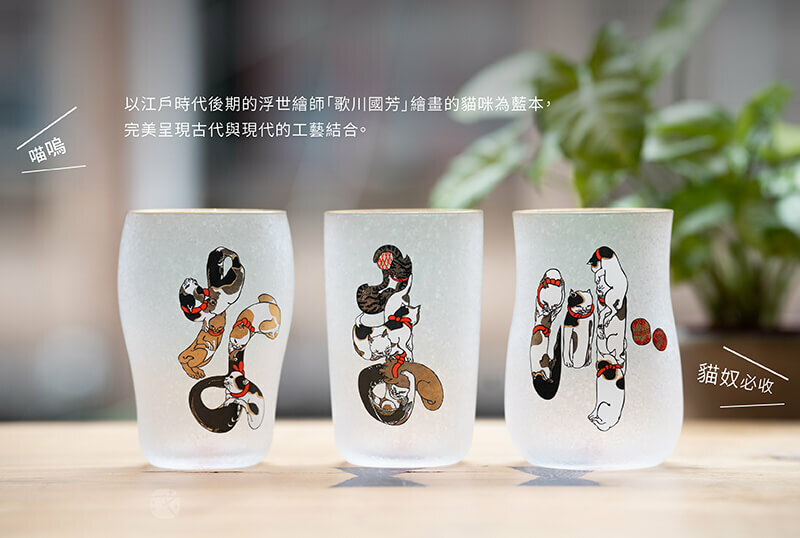 以江戶時代後期的浮世繪師「歌川國芳」繪畫的貓咪為藍本,酒杯上綁著鉢卷頭巾的貓咪在翩翩起舞,活潑俏皮,完美呈現古代與現代的工藝結合,陪伴您渡過療癒的每一天。