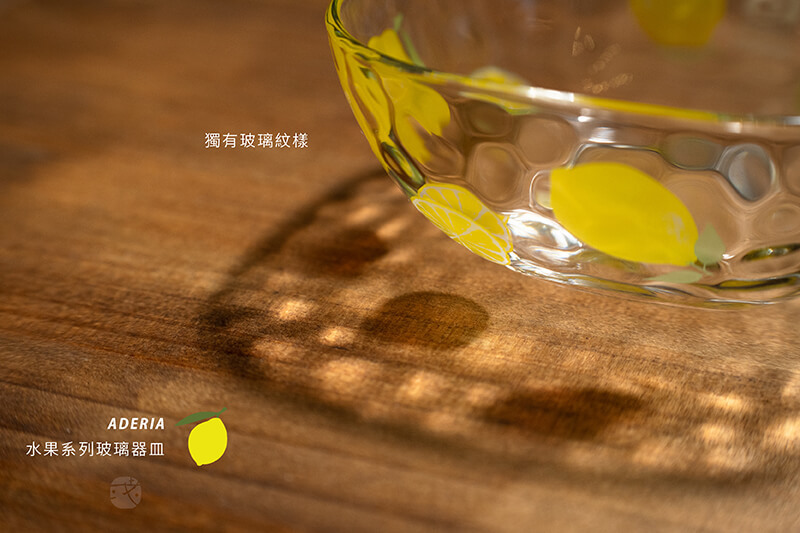 由日本玻璃大廠《石塚硝子》設計製造,ADERIA水果系列玻璃器皿,來自日本職人傳統精湛技術和製作手法,柔和的檸檬黃色,輕盈點綴玻璃碗。