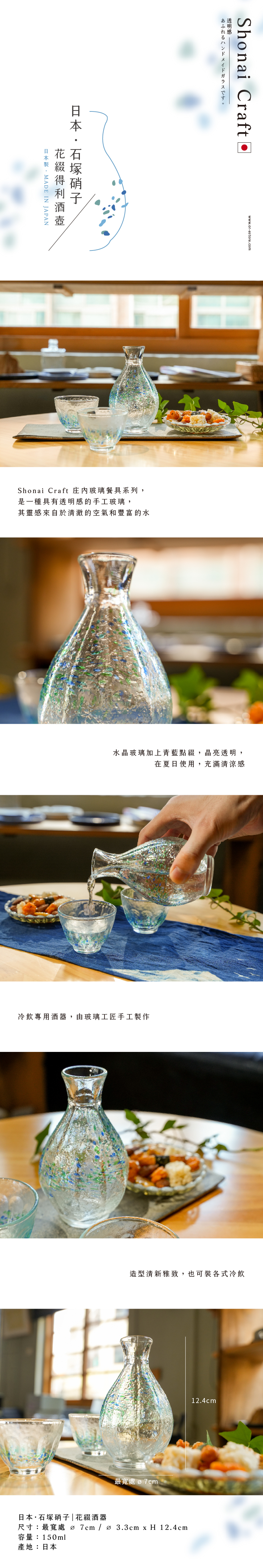 選自日本《石塚硝子》品牌-Shonai Craft 庄內玻璃餐具系列;具有透明感的手工玻璃,其靈感來自於清澈的空氣和豐富的水。 冷飲專用酒器,水晶玻璃加上青藍點綴,晶亮透明,在夏日使用,充滿清涼感!