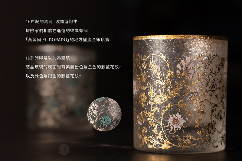 精選日本《石塚硝子》品牌,16世紀的馬可·波羅遊記中,探險家們相信在遙遠的彼岸有個「黃金國 EL DORADO」的地方,盛產金銀珍寶。此系列即是以此為靈感, 結晶玻璃的表面,歐洲典雅感細緻藤蔓花紋,搭配金銀邊設計,華麗且高貴的送禮首選!