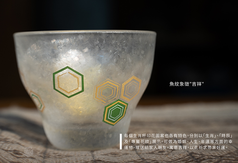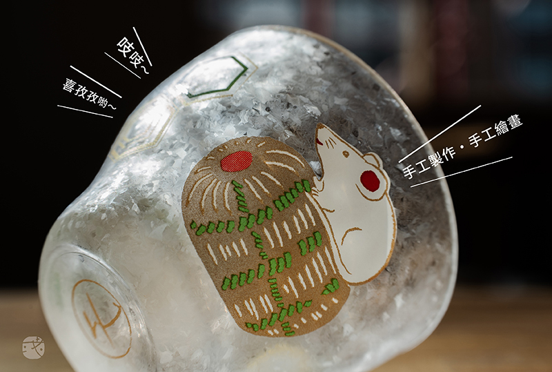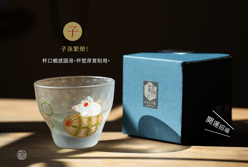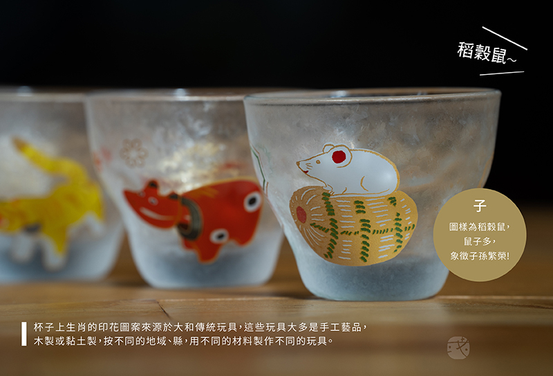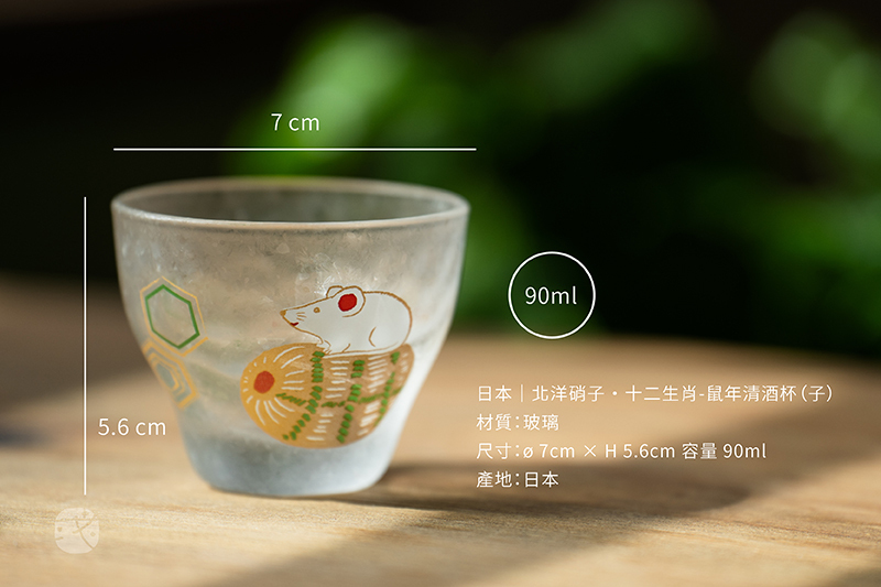 日本「石塚硝子」《十二生肖》系列清酒杯-鼠年為稻穀鼠,鼠子多,象徵子孫繁榮之寓意,魚紋象徵吉祥。厚實耐用手感,搭配獨特的冰晶紋理,展現出層次細膩之美!