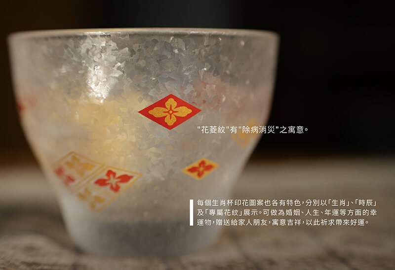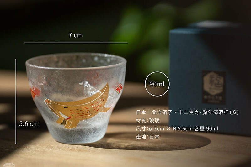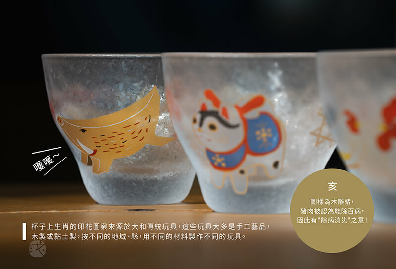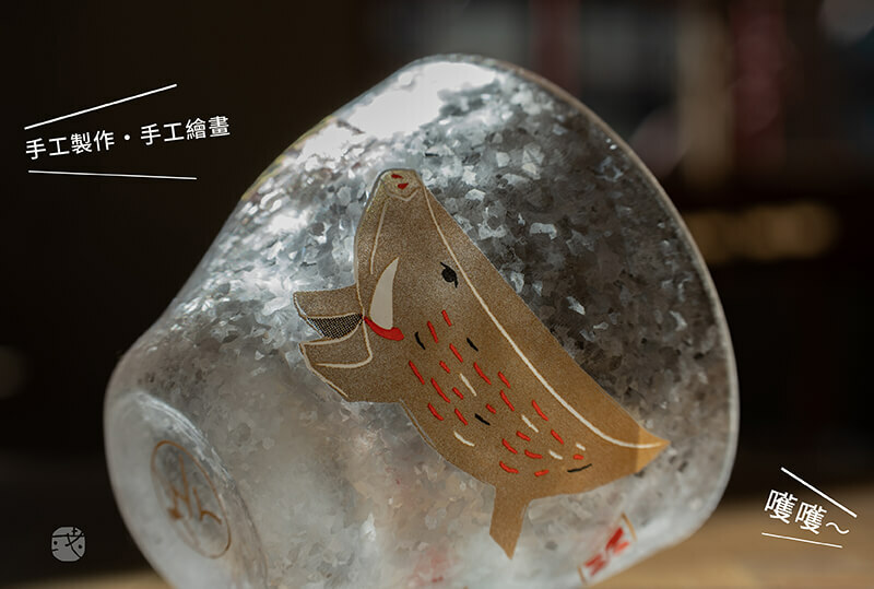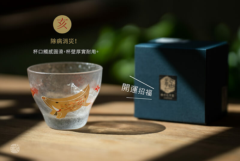 日本「石塚硝子」《十二生肖》系列清酒杯- 圖樣為木雕豬,豬肉被認為能除百病,因此有"除病消災"之意,而花菱紋有同樣的寓意。厚實耐用手感,搭配獨特的冰晶紋理,展現出層次細膩之美!