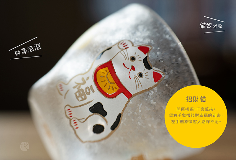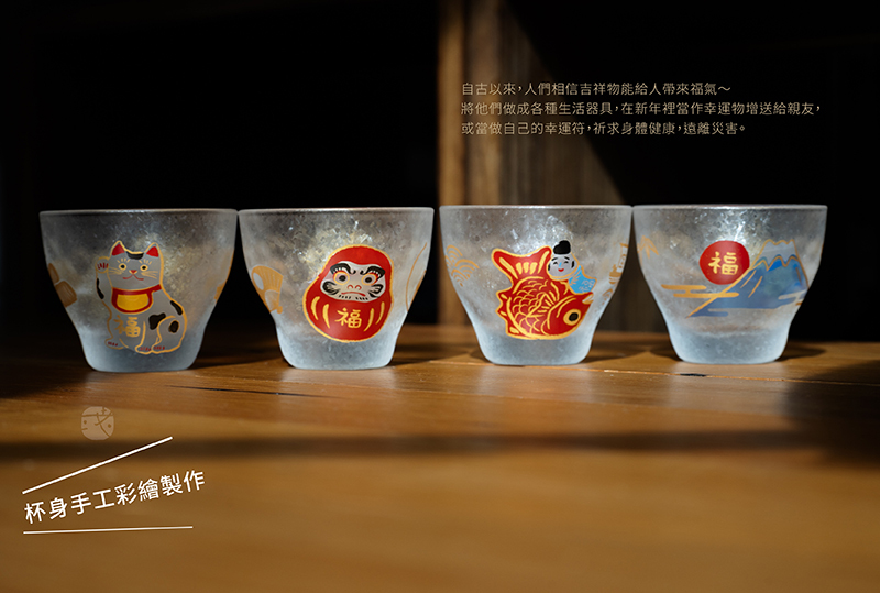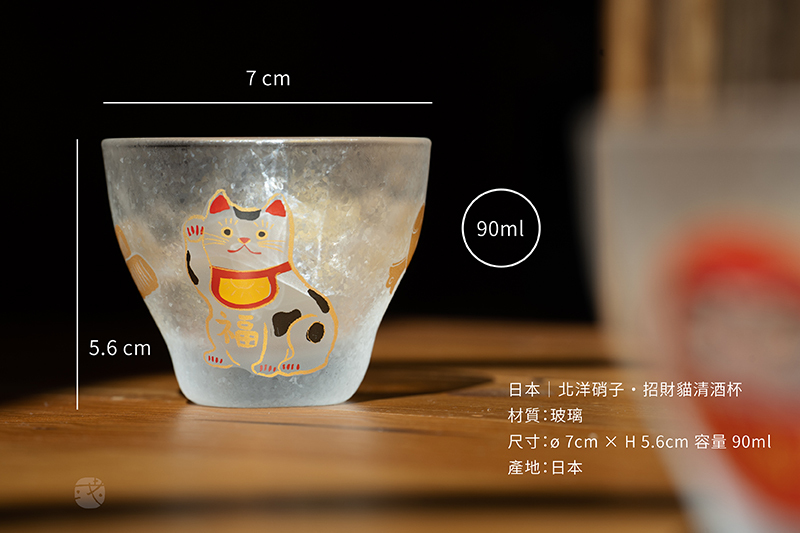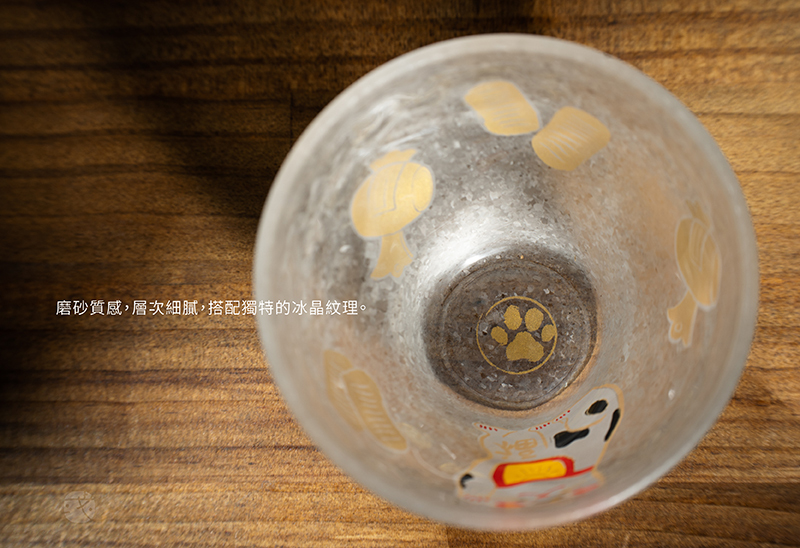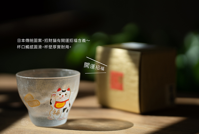 日本玻璃大廠《石塚硝子》設計製造,日本傳統圖案的招財貓有開運招福含義,杯口觸感圓滑,杯壁厚實耐用,搭配獨特的冰晶紋理,杯身手工彩繪製作,精美硬殼燙金包裝適合送禮。