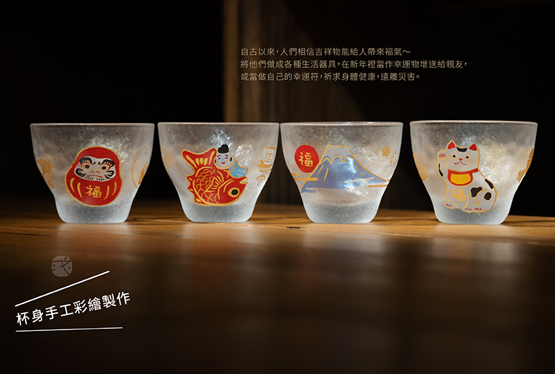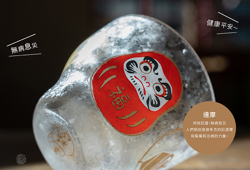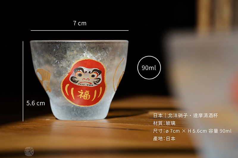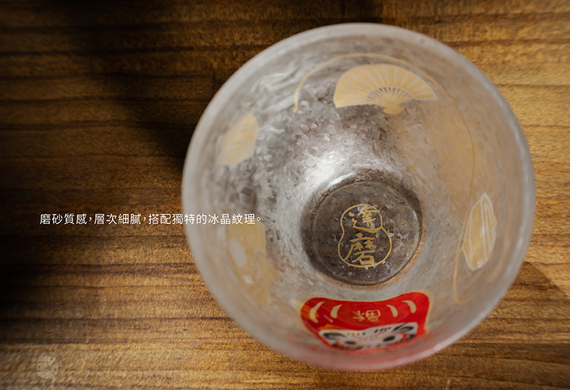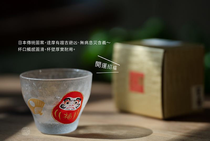 日本玻璃大廠《石塚硝子》設計製造,日本傳統圖案的達摩有趨吉避凶、無病息災含義,杯口觸感圓滑,杯壁厚實耐用,搭配獨特的冰晶紋理,杯身手工彩繪製作,精美硬殼燙金包裝適合送禮。