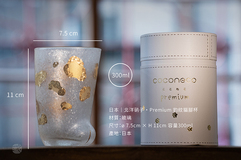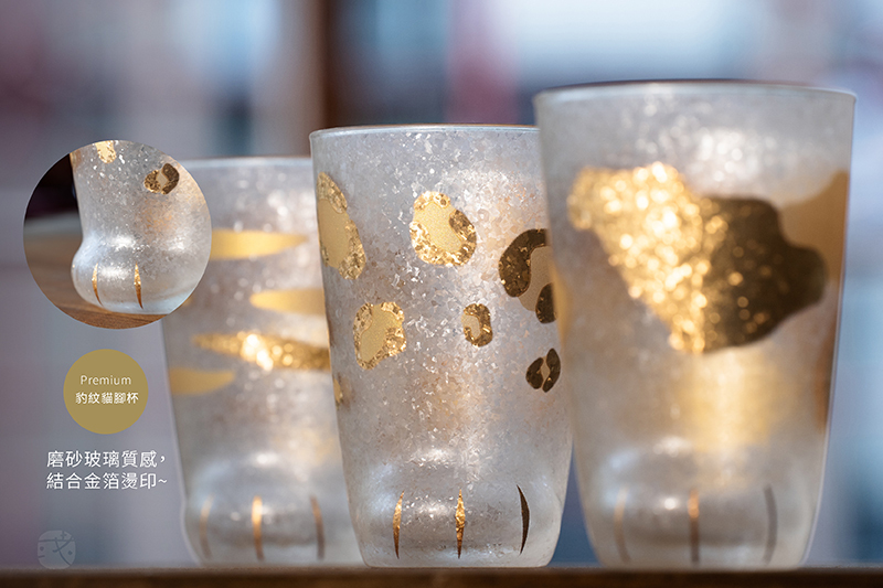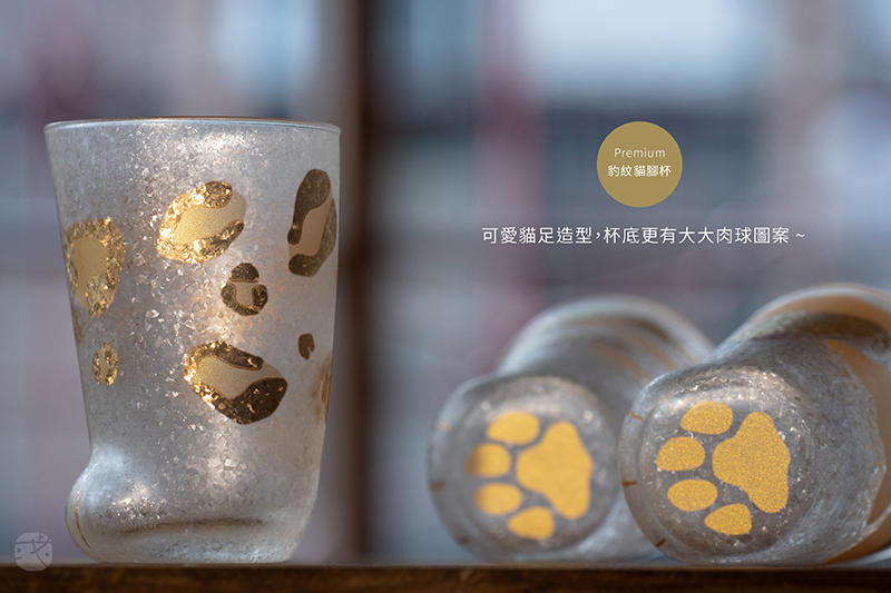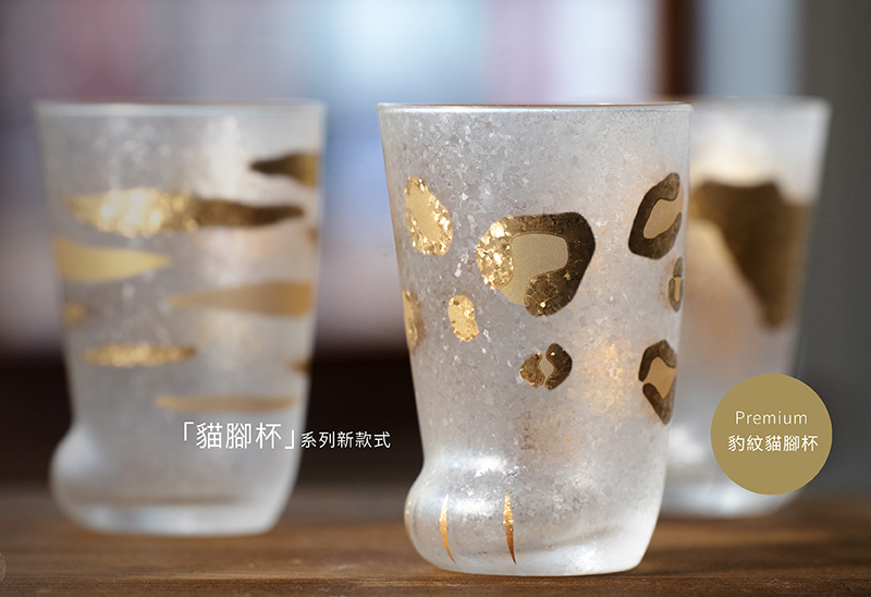 來自日本百年玻璃製品製作大廠「石塚硝子」,是「貓腳杯」系列新款式,磨砂玻璃質感,結合金箔燙印。