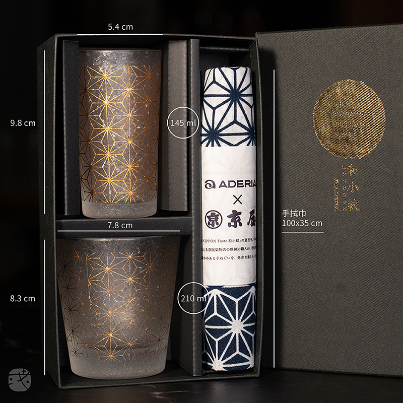 在霧面結晶玻璃上以華麗的燙金形式呈現,為日常飲用中,配上巖手縣百年老字號「京屋染物店」的原創手巾組合禮品套裝,帶來經典而優雅的生活風格!