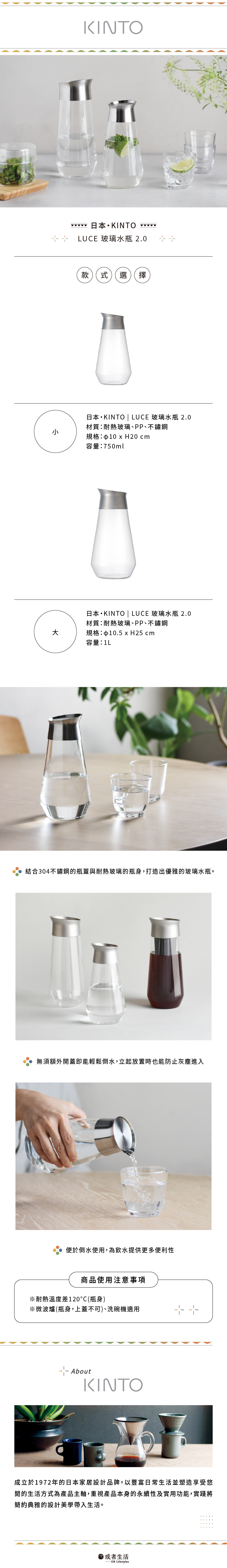 KINTO LUCE 系列玻璃水瓶,結合耐熱玻璃與 304 不鏽鋼瓶蓋,外型簡潔優雅。免開蓋即可倒水,防塵不滴漏,2.0 改良瓶口更好用,提供 750ml、1L,居家與店用皆適合。