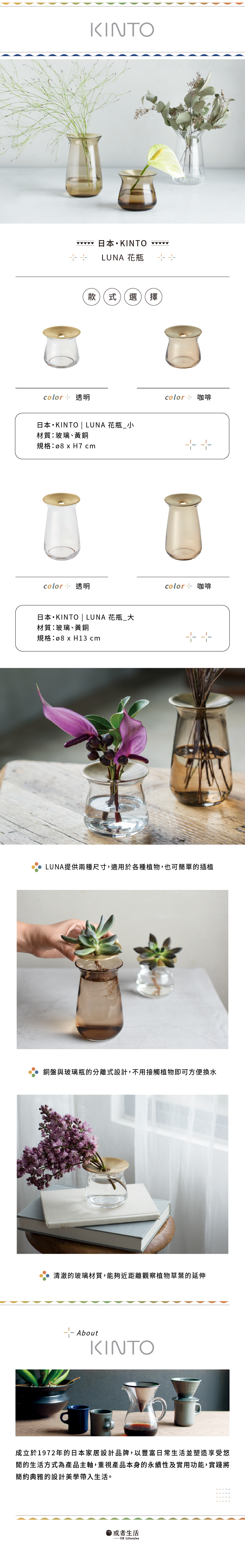 LUNA 花瓶專為只需水、少光的室內植物設計,由玻璃與黃銅組成。分離式設計方便換水,透明與咖啡色玻璃可近距離觀察根葉生長,黃銅盤隨時間呈現光澤變化,增添植物與空間的魅力。