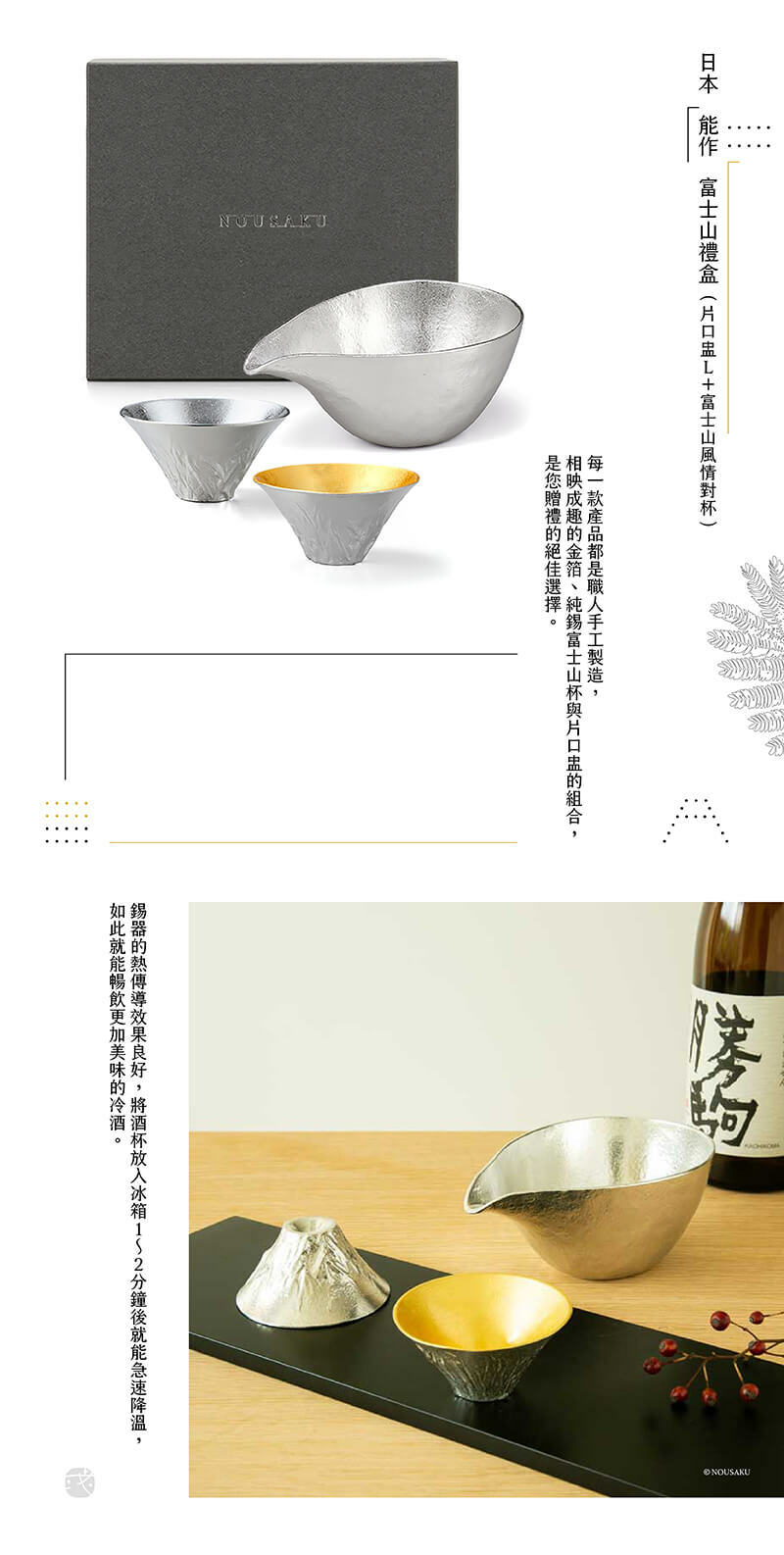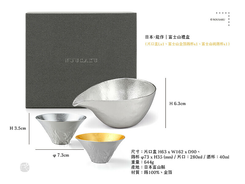 富士山禮盒是由片口盅-L搭配純錫、金箔的富士山風情杯組成,錫器的熱傳導效果良好,將酒杯放入冰箱1-2分鐘後就能急速降溫,如此就能暢飲更加美味的冷酒。
