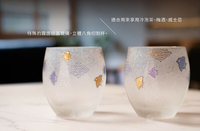 精選日本《石塚硝子》品牌,波千鳥的「波」有著平穩繁榮意思,「千鳥」則有夫婦圓滿・家内安穩,目標達成願的祝福之意,特殊的霧面結晶玻璃,立體八角切割杯身, 適合用來享用冷泡茶、梅酒、威士忌。