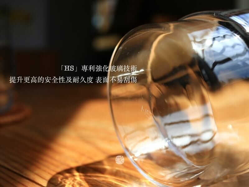 「HS」專利強化玻璃技術,獨家鈉鈣玻璃製成,表面不易刮傷;杯子擁有更高的安全性及耐久度,且杯身輕薄,更貼合飲用口感。