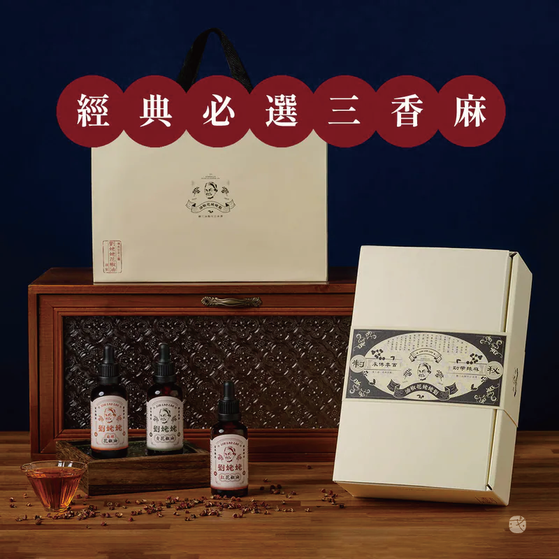 劉姥姥經典三入組禮盒,內含紅、青、麻辣花椒油各50ml,一次品嚐三款經典川麻風味。香氣濃郁、麻感十足,送禮滿意度高達99%,日常使用或年節贈禮都非常適合。