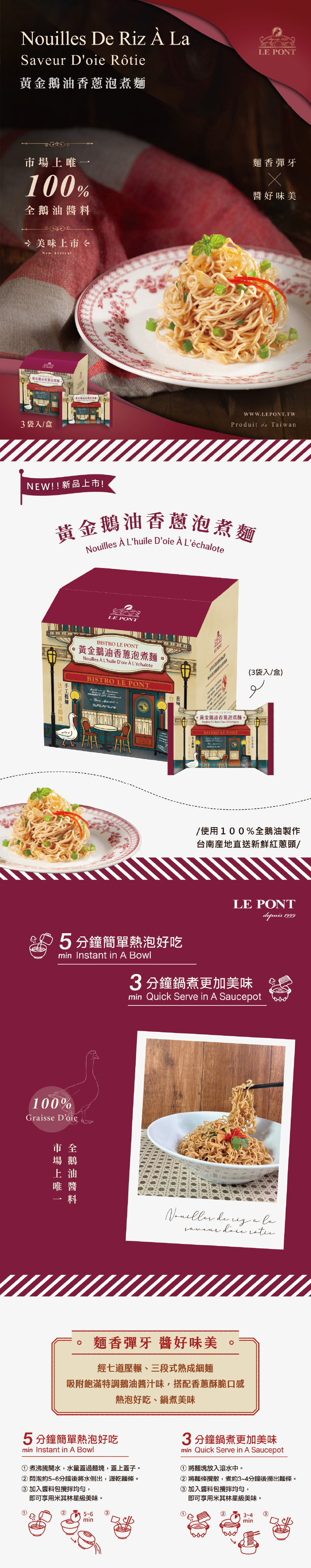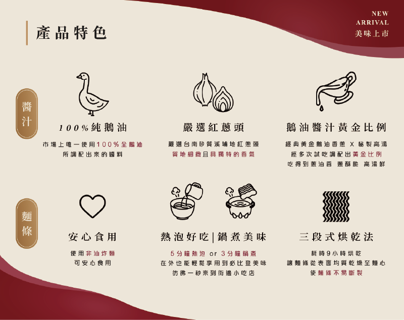 ●規格:106±4.5公克 x3包 (單包內含麵體68公克、經典風味鵝油醬汁包33公克、黃金鵝油香蔥酥包5公克)