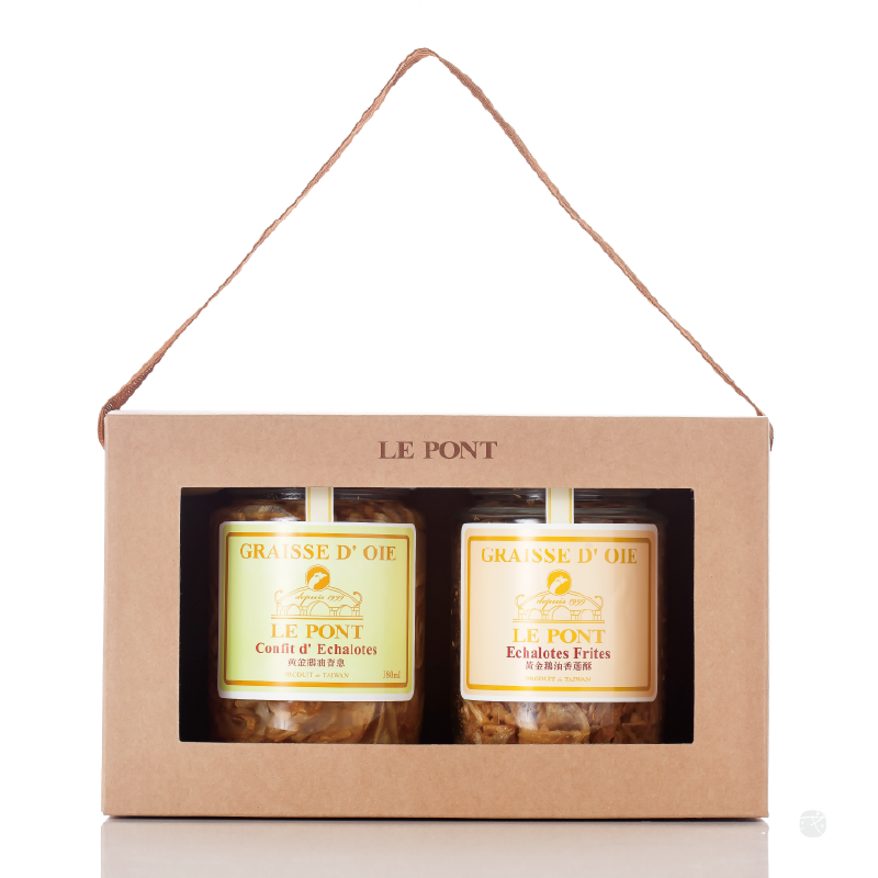 以赤牛皮呈現自然質樸的二入禮盒系列,前開窗可見金黃鵝油香蔥,棉布提繩與盒一體成型,兼具環保、美味與美觀,方便攜帶。