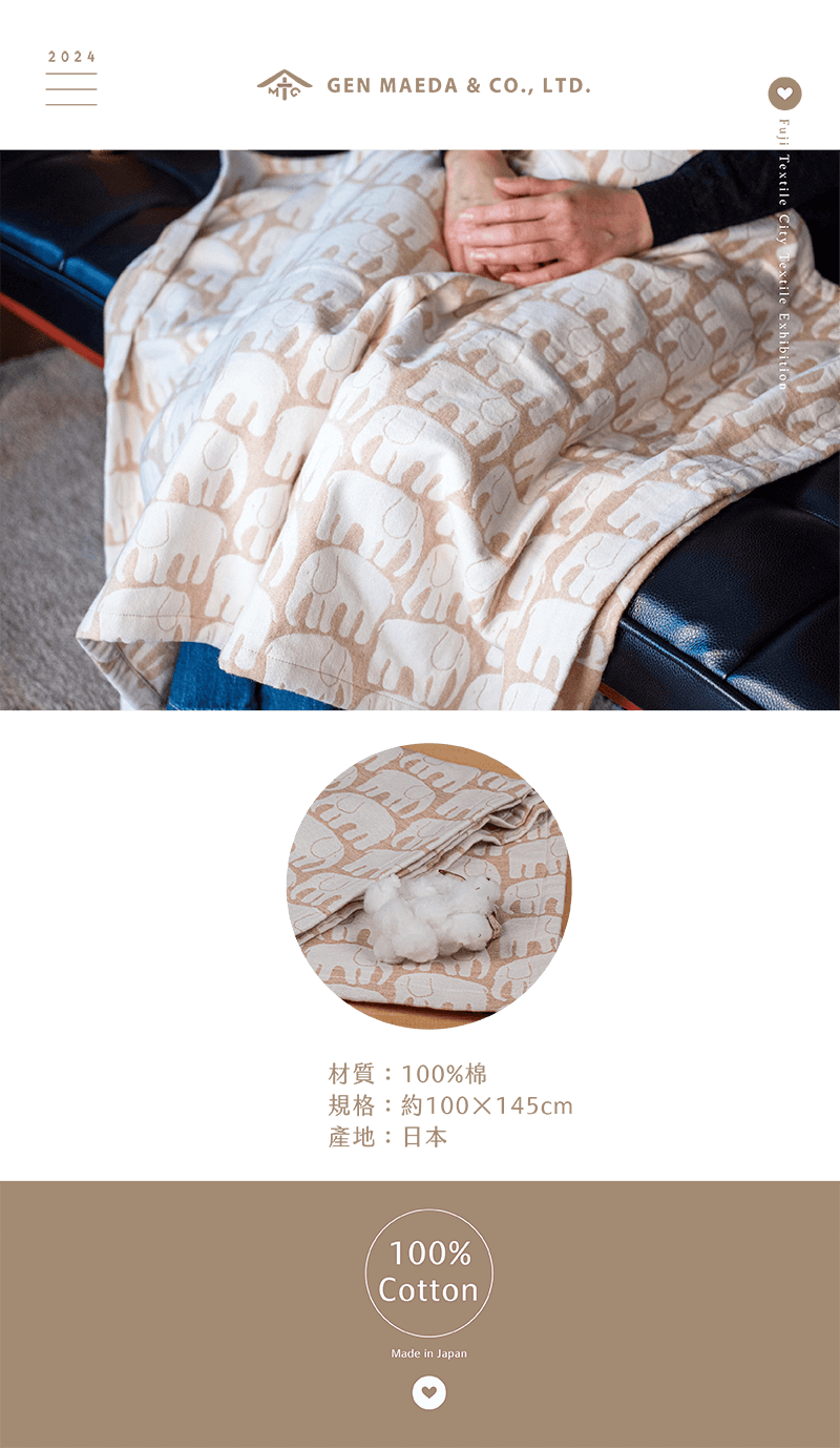 這是一張大象圖案的休閒毯。採用彩棉編織的拉絨布料製成,觸感柔軟。