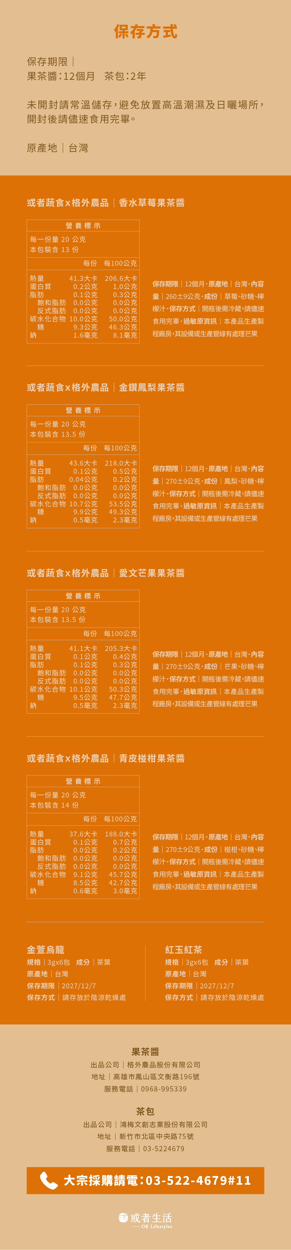 果茶醬以格外品製成,單純成分但富含水果。共有「金鑽鳳梨果茶醬」、「愛文芒果果茶醬」、「青皮椪柑果茶醬」以及「香水草莓果茶醬」四種口味可選擇。