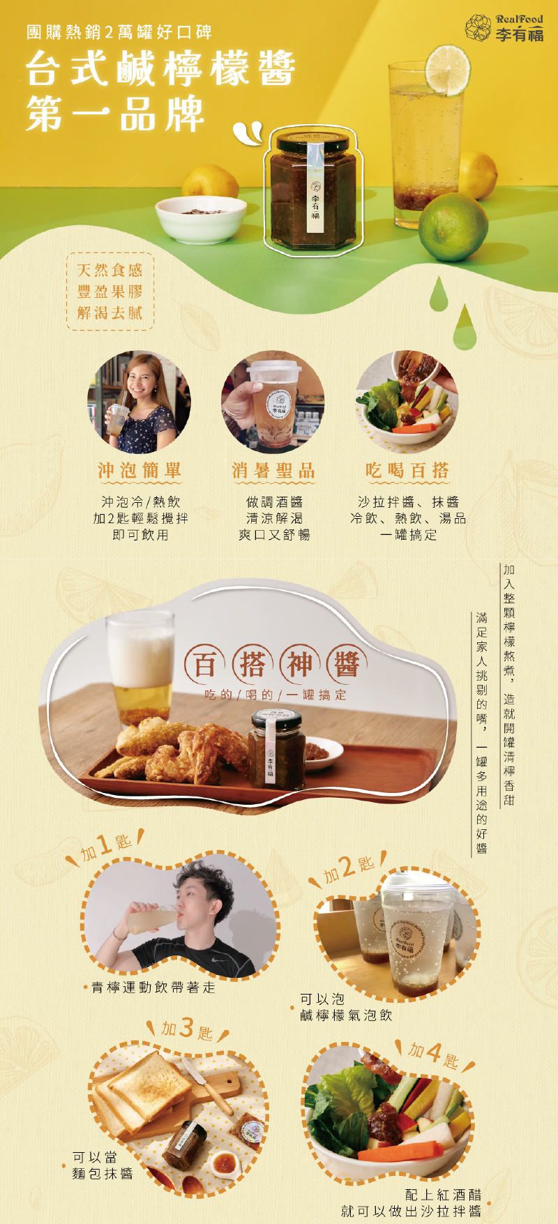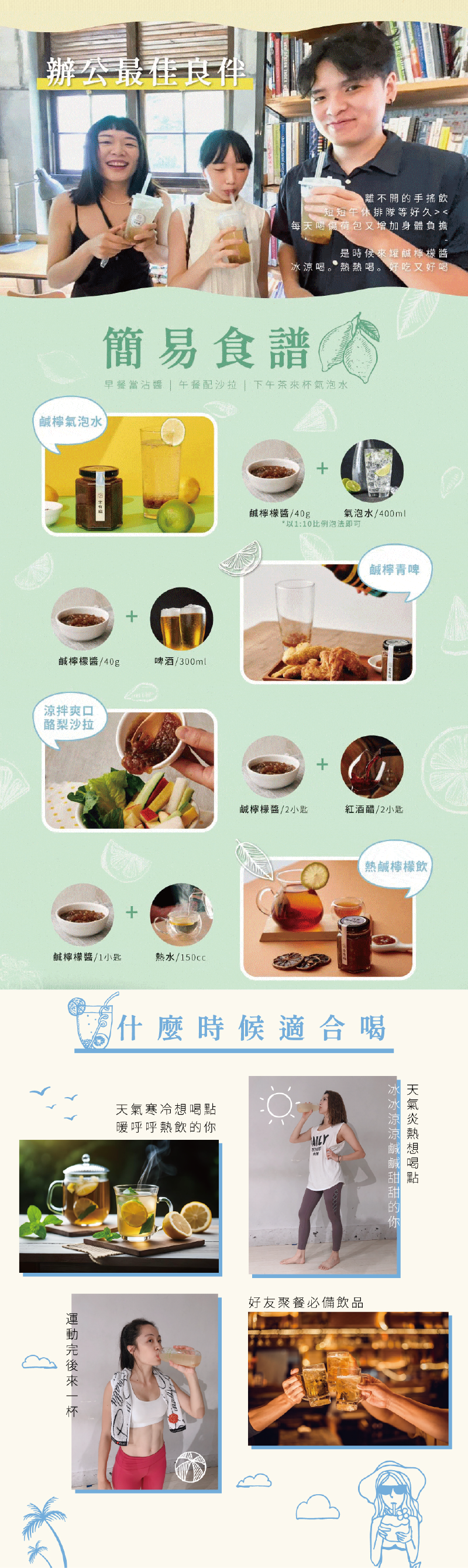 輕鬆一匙製作鹹檸七、鹹檸檬啤酒,喝溫的還能潤喉促進新陳代謝,也能當運動飲料喝。加入優格薄荷葉也可以成為最解膩的西式沾醬。