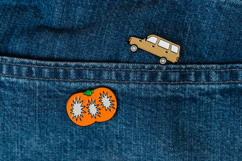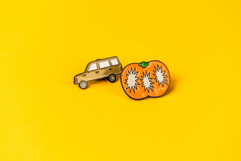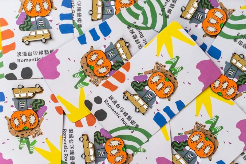 ● 以旅行中的汽車和柿子,製作一組(共兩款)金屬徽章,固定於主視覺插畫背卡上,展現一趟充滿活力的藝術季旅程。