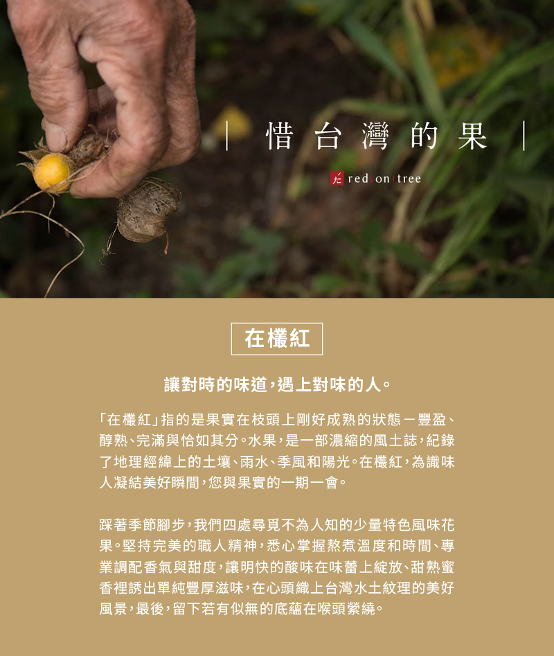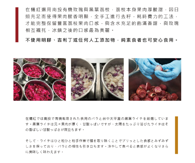 在欉紅選用南投有機玫瑰與台中太平黑葉荔枝,荔枝本身果肉厚酸甜,因日照充足而使得果肉酸香明顯!