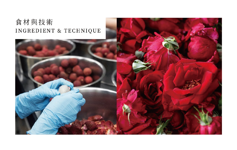 全手工進行去籽,耗時費力的工法,才能完整保留豐富荔枝果肉口感,與含水充足的飽滿香甜,與玫瑰相互襯托。