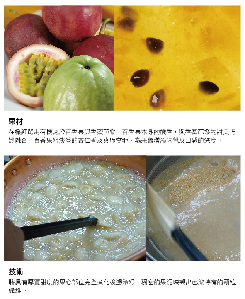 在欉紅選用有機認證百香果與香蜜芭樂,百香果本身的酸香,與香蜜芭樂的甜美巧妙融合,百香果籽淡淡的杏仁香及爽脆質地,為果醬增添味覺及口感的深度。