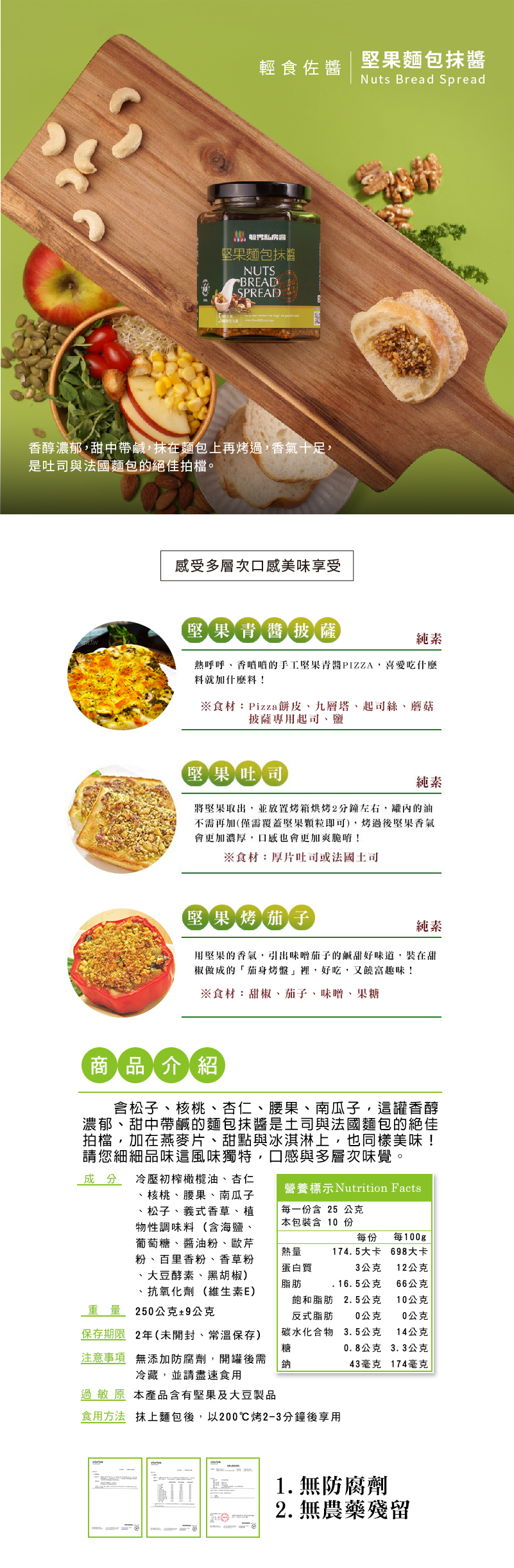 特選5種堅果,搭配多種義式香草與冷壓初榨橄欖油炒製,土司與法國麵包的絕佳拍檔,加在燕麥片、甜點與冰淇淋上,也同樣美味!