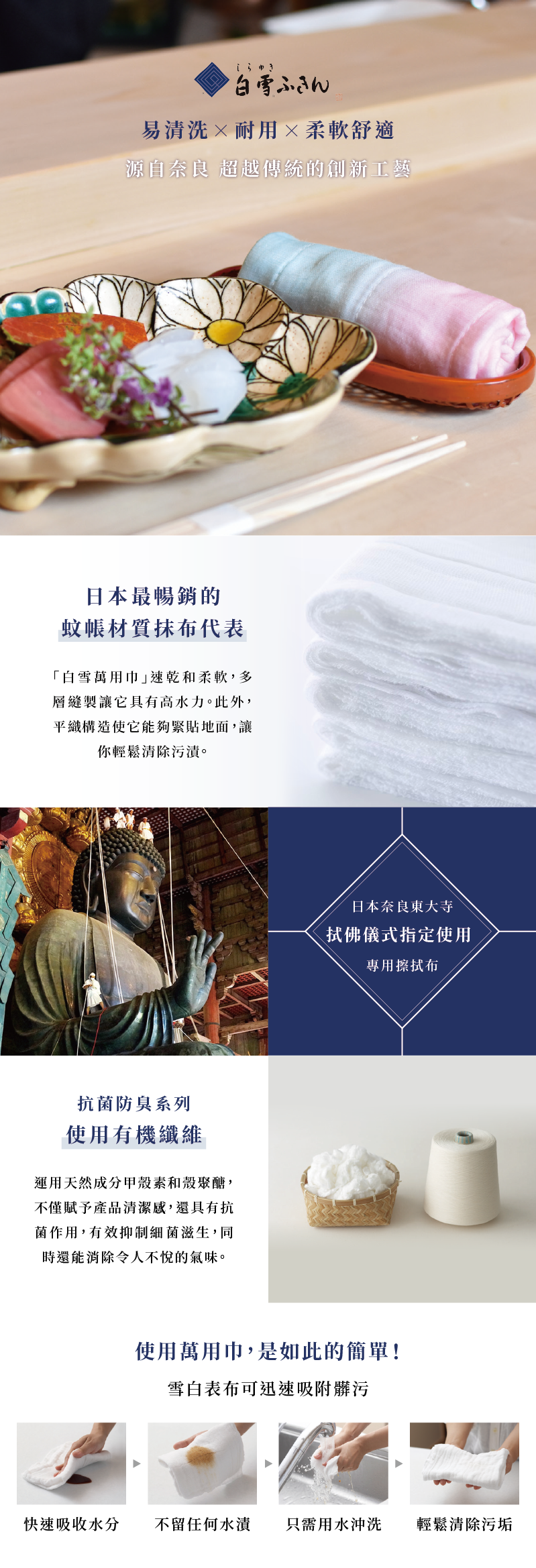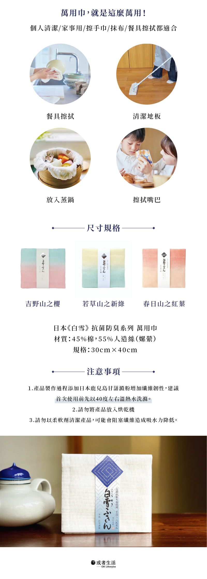 1.產品製作過程添加日本鹿兒島甘藷澱粉增加纖維韌性,建議首次使用前先以40度左右溫熱水洗滌。