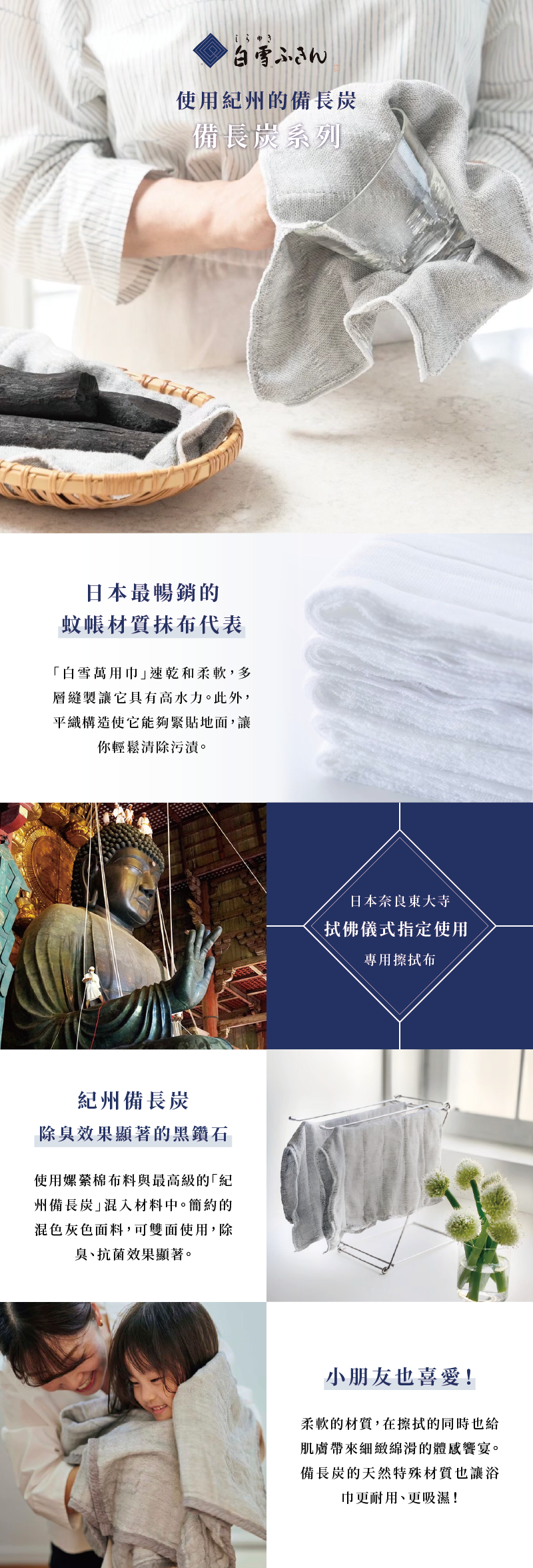 奈良織物老舖手工製作,採用嫘縈棉布料,使用最高級的「紀州備長炭」混入材料中。