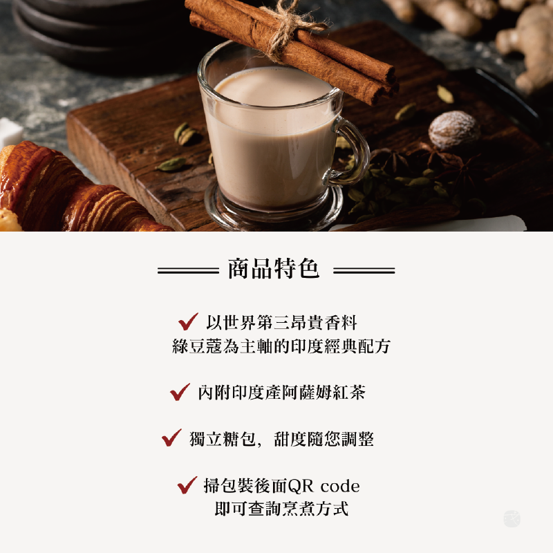 ●成分:白砂糖、印度產阿薩姆紅茶、綠豆蔻、肉桂、八角、肉豆蔻、黑胡椒、薑、丁香。